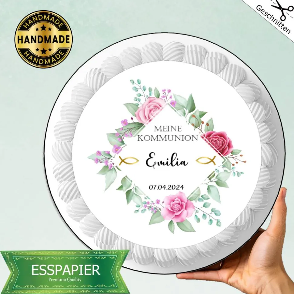 Dieser Tortenaufleger versprüht einen romantischen Look und ist ein unvergesslicher Blickfang auf jeder Kommuniontafel.