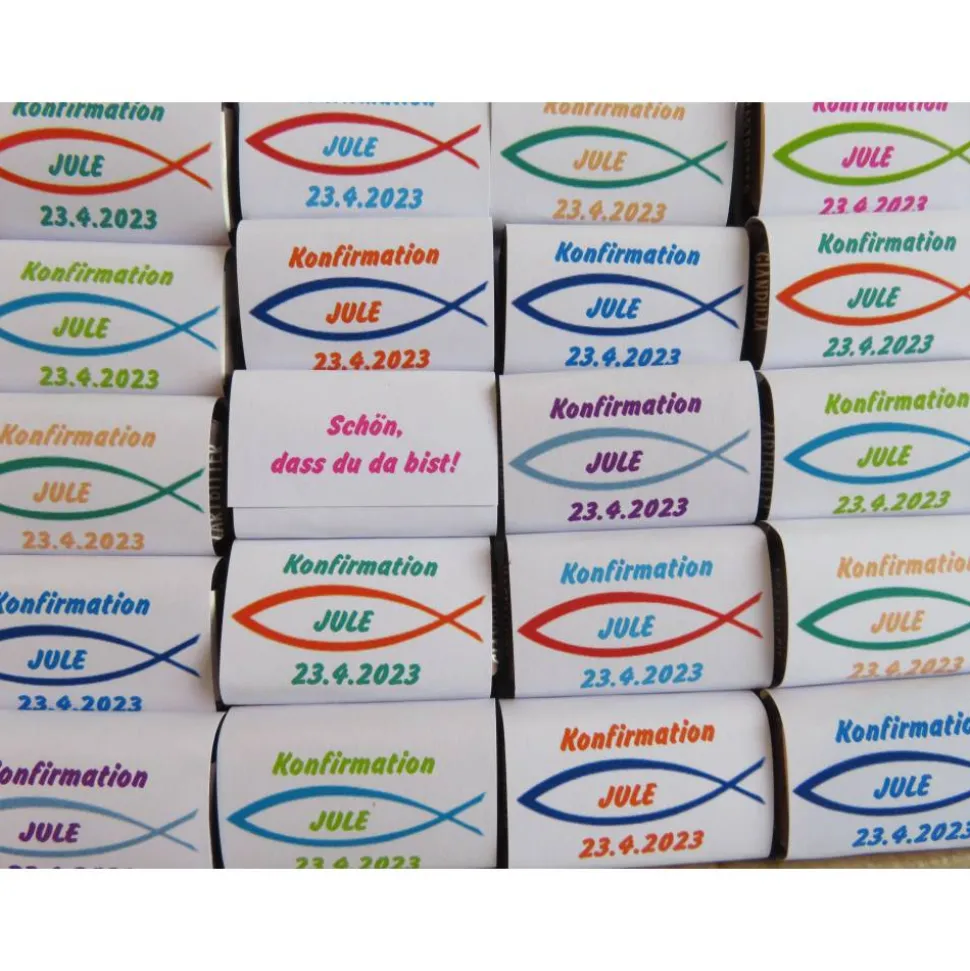 Schokoladentäfelchen mit einer Banderole umlegt, fertig bedruckt nach ihren Wünschen und Angaben –