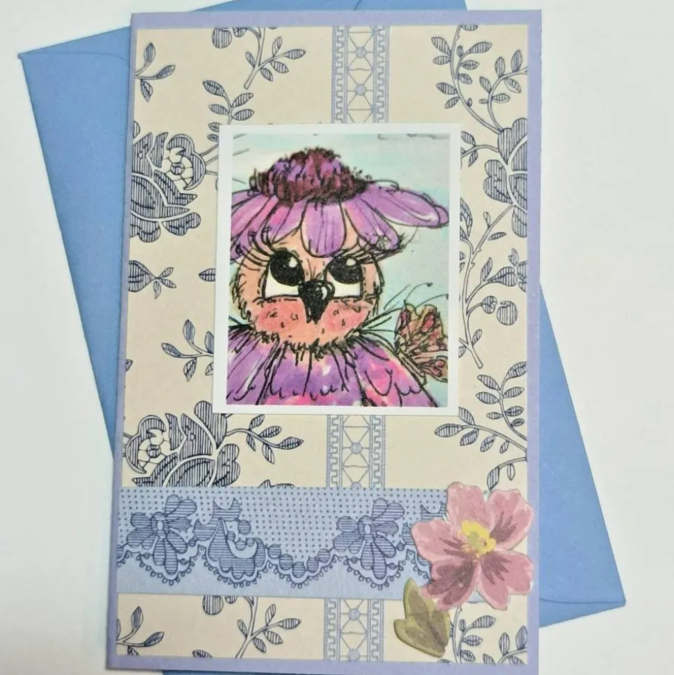 Vier in pastell Farben gestaltete Mini Klappkarten mit hochwertigen Drucken meiner Eulen Aquarelle habe ich hier als 4er Set zusammengestellt.