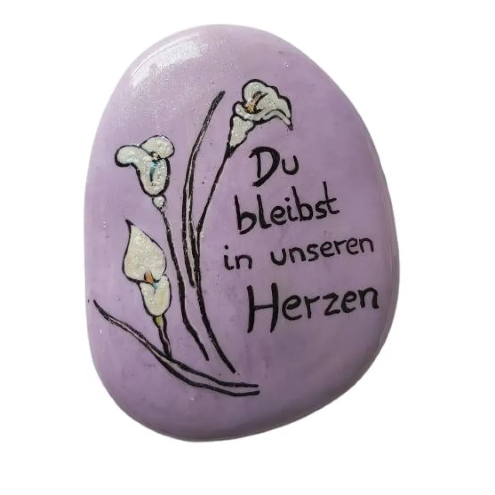 Der tröstliche Spruch „Du bleibst in unserem Herzen“ erinnert daran, dass die geliebte Person immer präsent und unvergessen bleibt. Die weißen Calla Blumen symbolisieren dabei Reinheit, Liebe und Respekt und stehen für die Verbundenheit über den Tod hinaus.