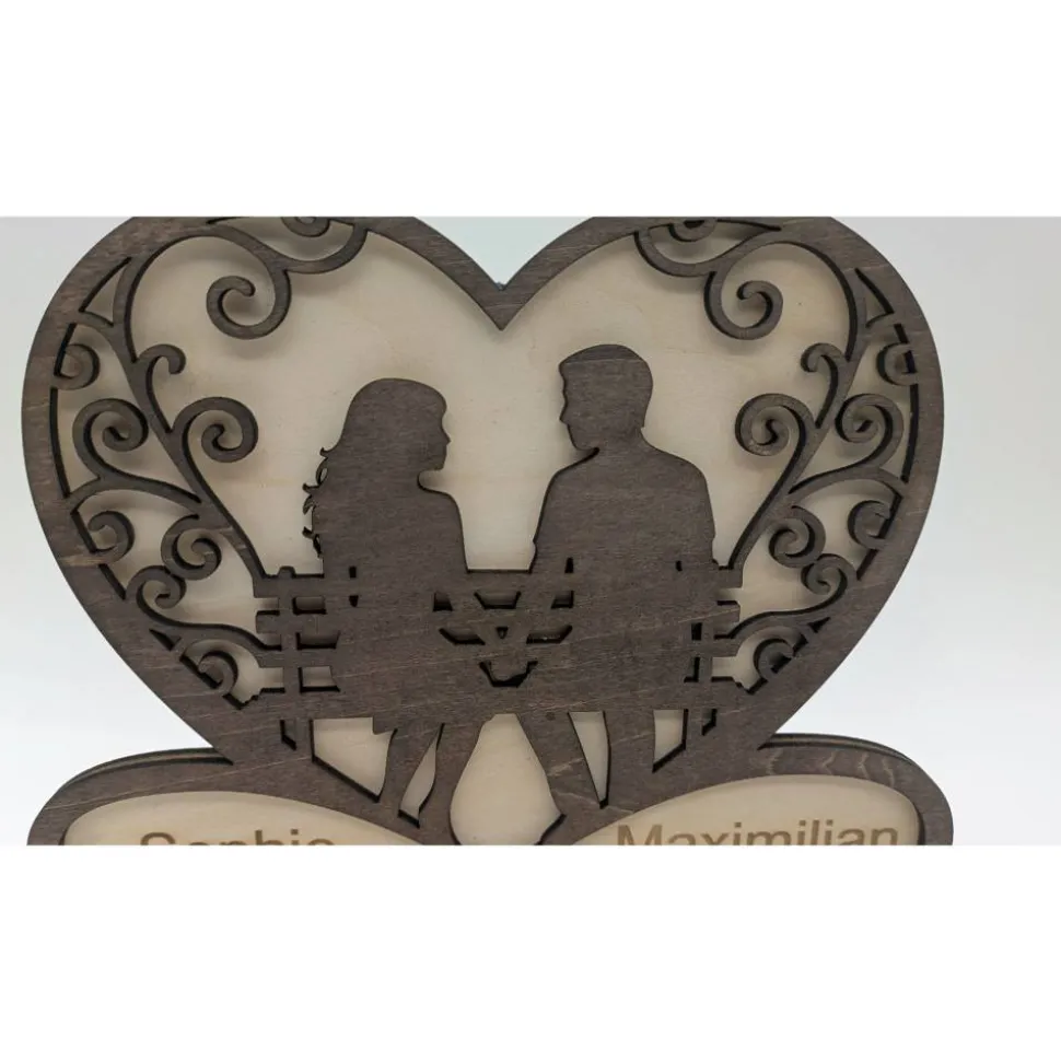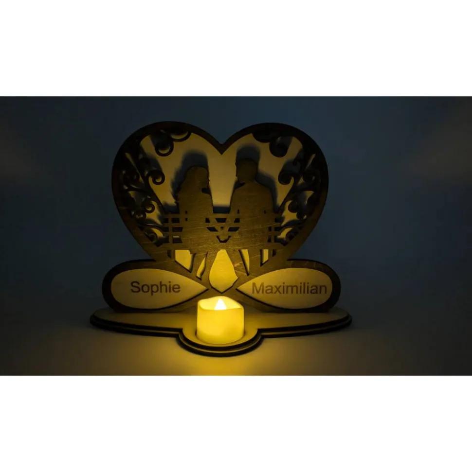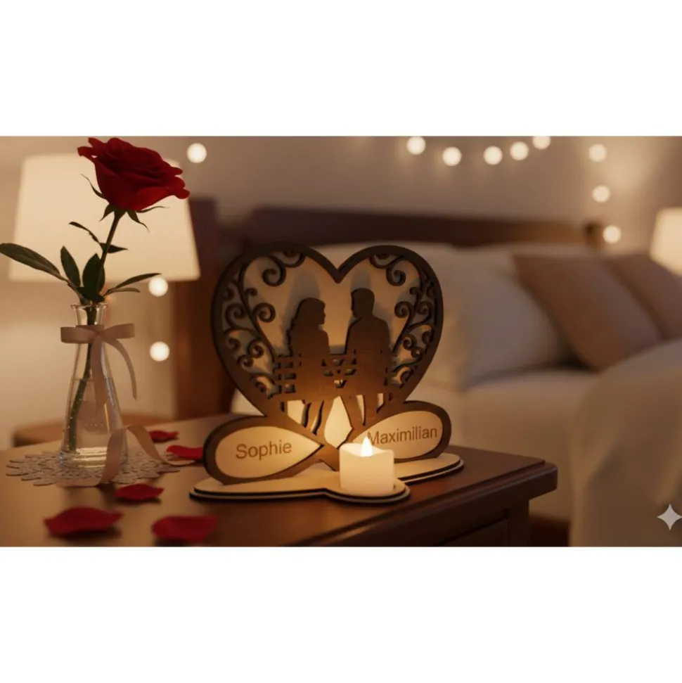 Setze ein Zeichen der Liebe mit dem personalisierten Holz-Windlicht „Ewige Verbundenheit“. Dieses exklusive Windlicht aus 3 mm Balsaholz (Echtholz) verbindet romantisches Design mit individueller Gravur. Die kunstvoll gestaltete Silhouette eines Paares, eingerahmt von einem filigranen Herz, wird zum Blickfang in jedem Raum – ob auf dem Sideboard, im Regal oder als stilvolle Tischdekoration.