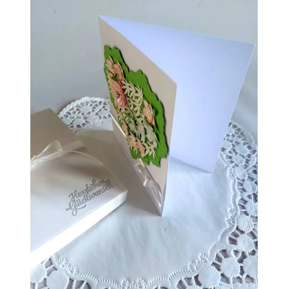 Die Karte und die Box werden aus Tonkarton, feinem Leinenpapier, elegantem Satinband sowie Perlen gefertigt. Alle Elemente sind sorgfältig geschnitten, gefalzt, gestanzt, die Blütenränder gewischt und alles stabil verklebt.