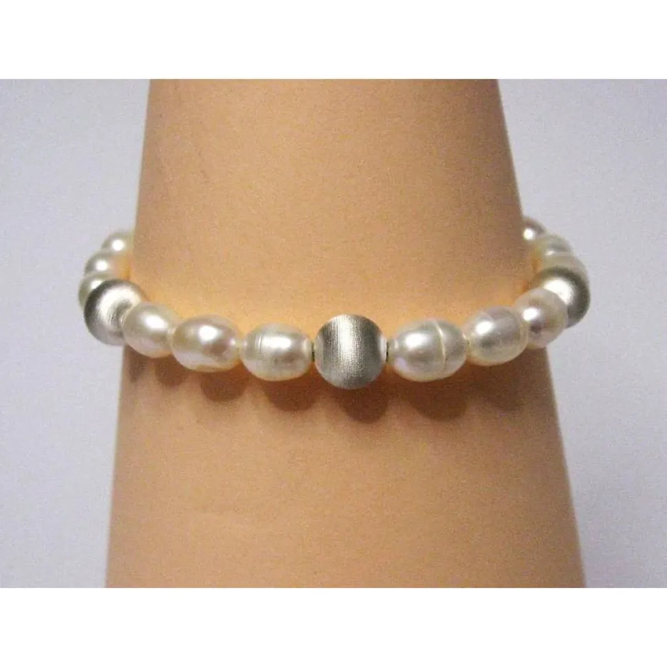 Dieses Perlenarmband besteht aus edlen Zuchtperlen-Oliven in Weiß, kombiniert mit 8 mm satinierten Kugeln sowie einem Verschluss aus Silber 925.