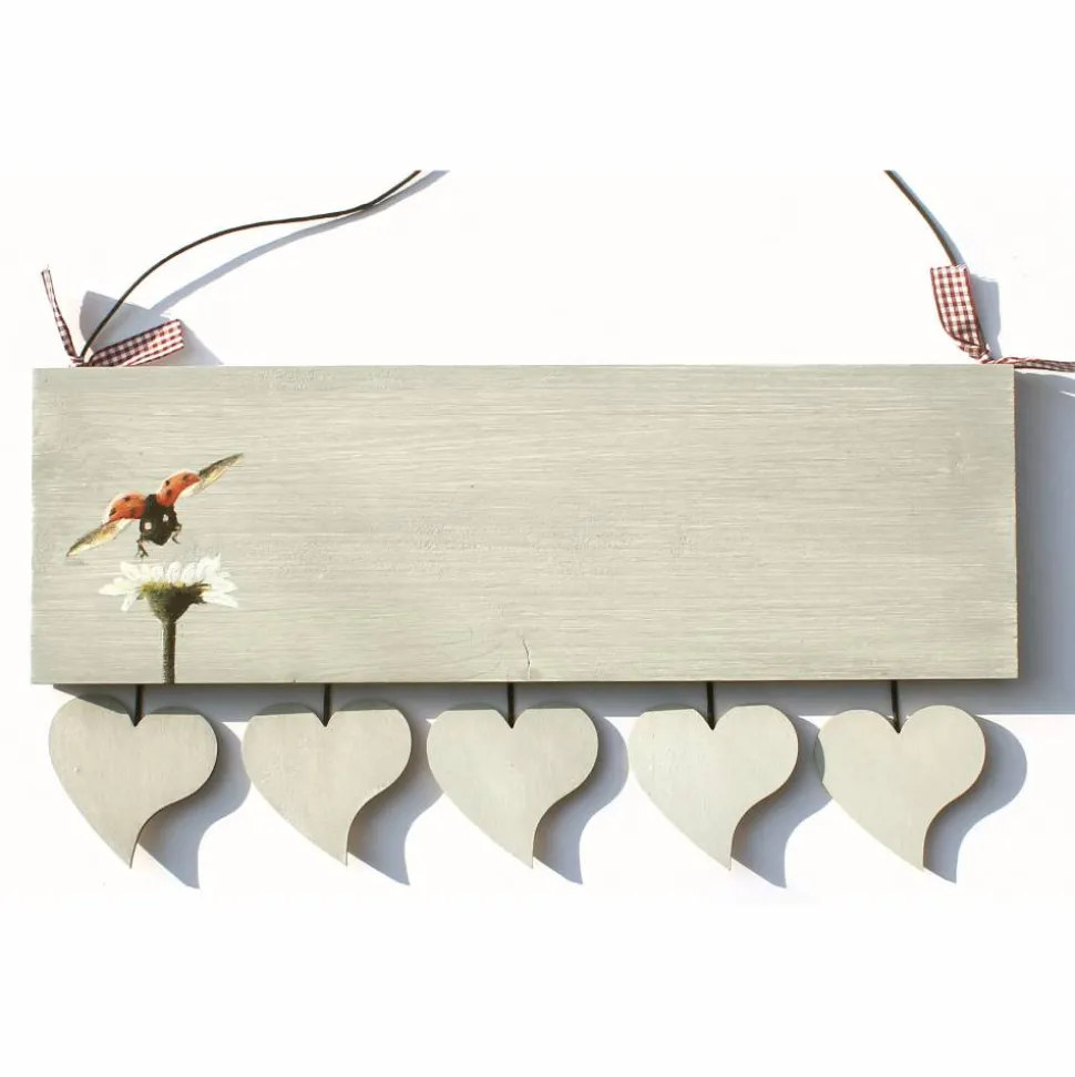 Das edle Holzschild (Maße: 12,5 cm x 40 cm) wird liebevoll handbemalt – auf Wunsch in deiner Lieblingsfarbe, zum Beispiel Grau, Hellgrau, Lindgrün, Dunkelgrün, Dunkelblau, Bordeauxrot oder Schwarz. Detailreich verzieren Marienkäfer und Margerite das Namensschild. Die Beschriftung erfolgt dreizeilig mit „Hier wohnt das Glück und Familie“ sowie deinem Nachnamen, in deiner Wunschschriftart. Bis zu 6 individuell beschriftete Herzanhänger mit Vornamen machen dein Familienschild zum absoluten Unikat.