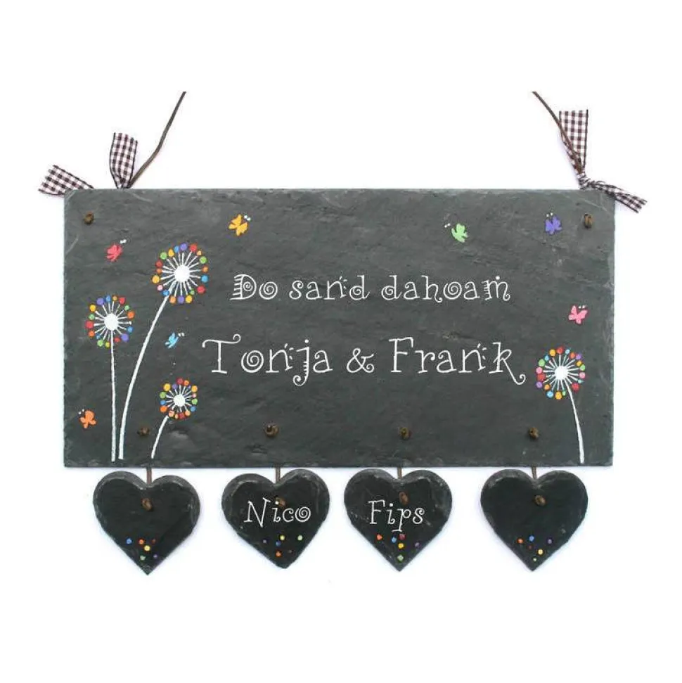 Dieses dekorative Familienschild wird liebevoll handgefertigt und mit Deinen Wunschangaben gestaltet. Das wetterfeste Schieferschild eignet sich ideal für den Eingangsbereich und ist ein echter Blickfang für Drinnen und Draußen. Mit Pusteblumen und Schmetterlingen handbemalt, erhält Dein Türschild eine einzigartige, persönliche Note.