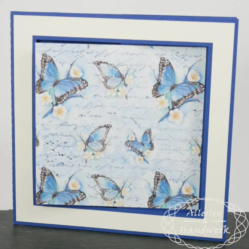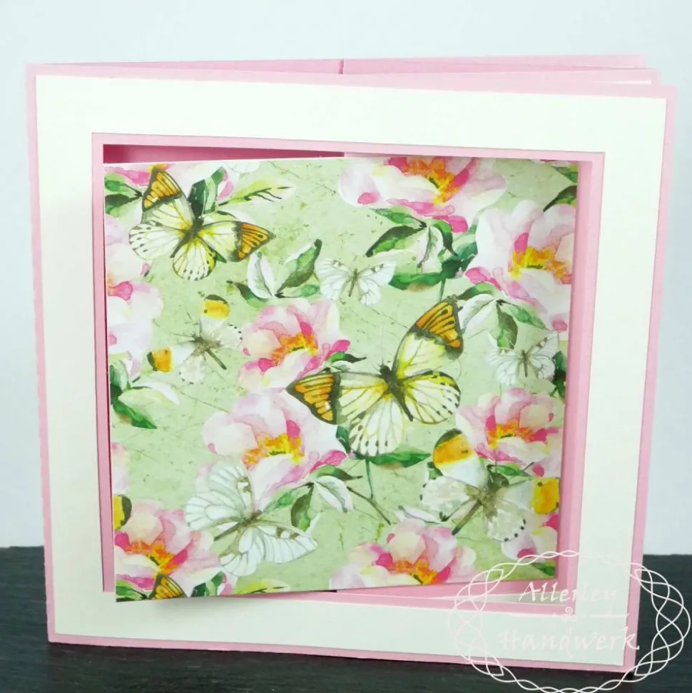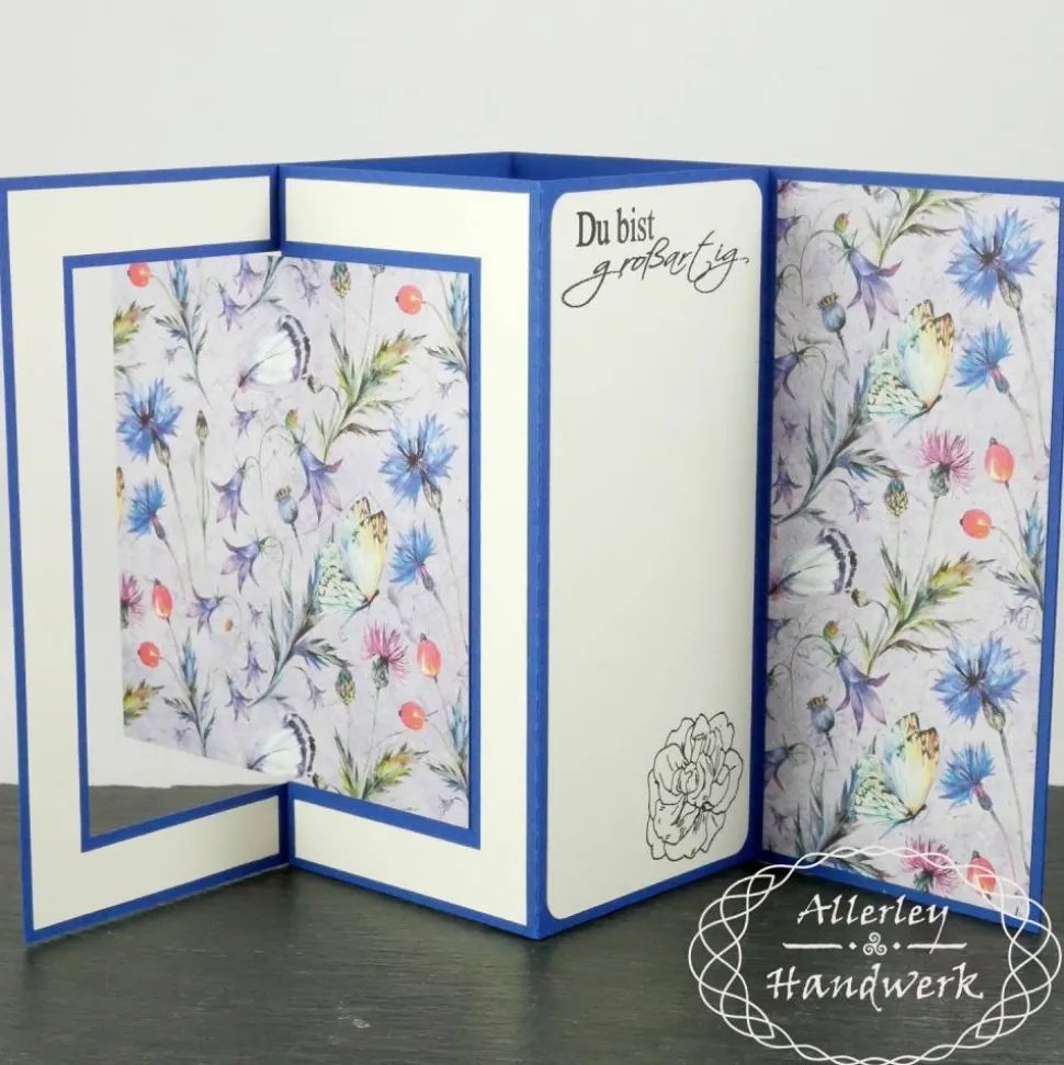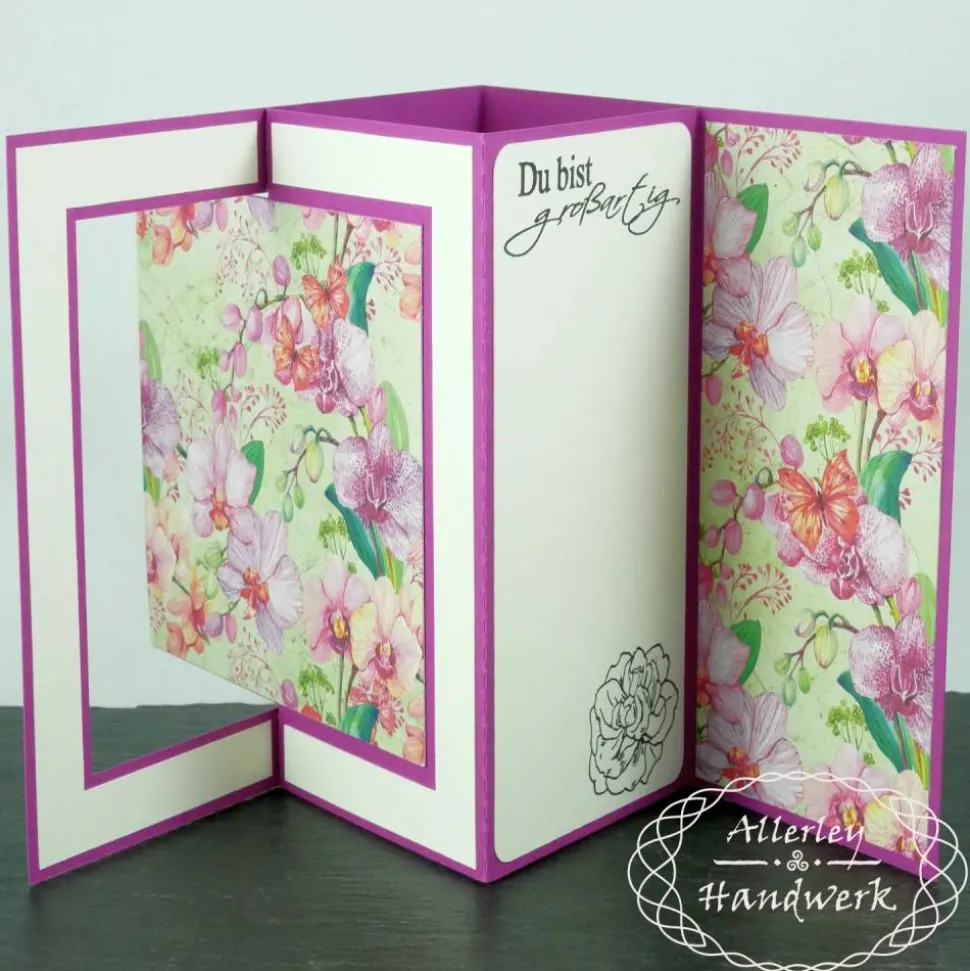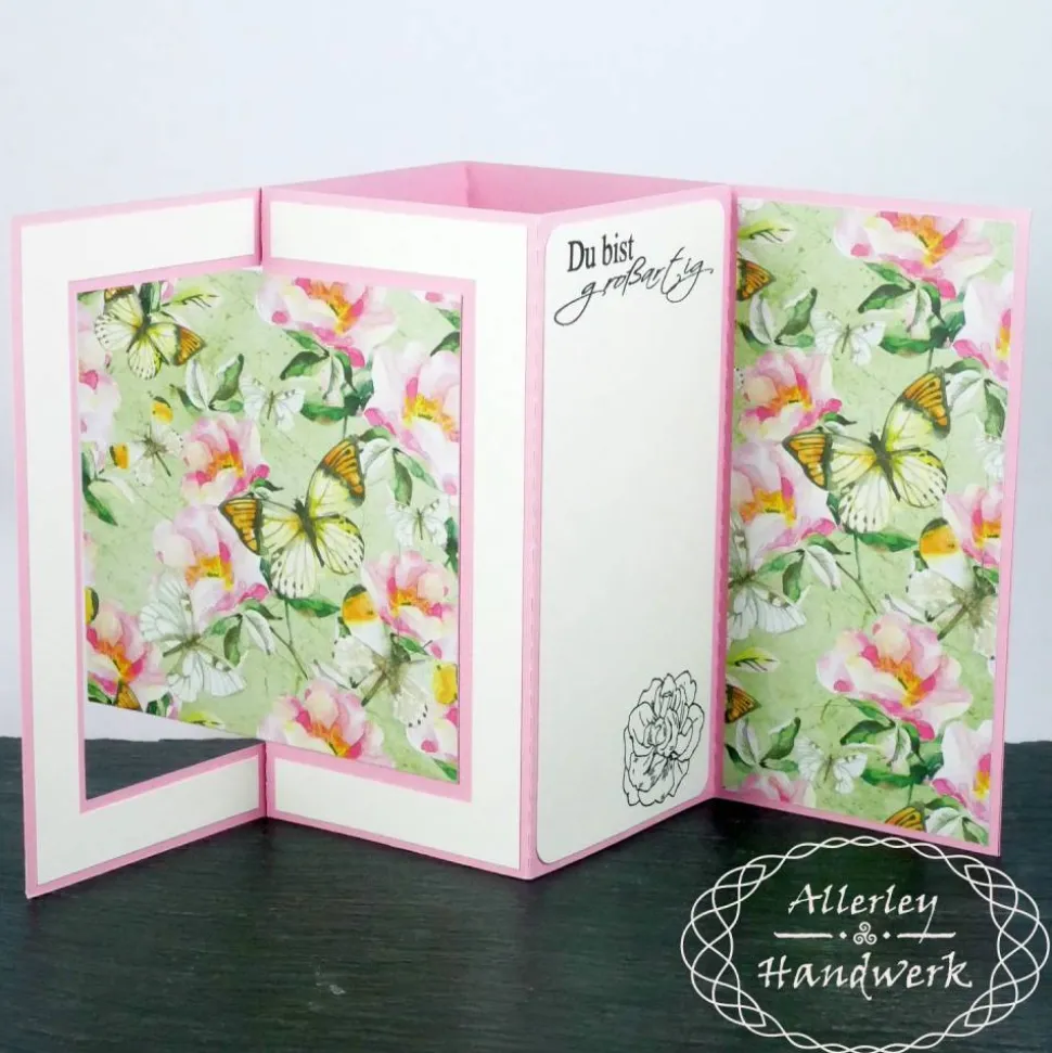 Nicht nur das quadratische Großformat mit knapp 15 cm Größe ist bei uns eher ungewöhnlich, „Mona“ ist zudem eine sogenannte Swing-Fold-Karte, bei der man auch geöffnet noch das Frontmotiv sehen kann. Davon abgesehen kann man sie sehr dekorativ aufstellen, wobei sie eine Breite von über 20 cm erreicht.