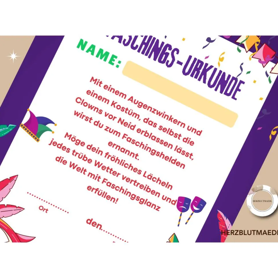 Mit diesen persönlichen Urkunden werden die Kids stolz ihre „Faschings“-Auszeichnung präsentieren. Hol sie dir jetzt und mach deine Faschingsparty zu einem unvergesslichen Abenteuer!