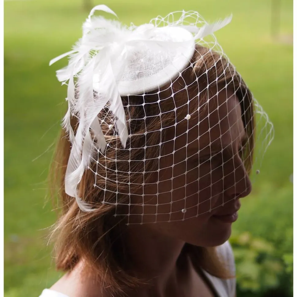 Er ist komplett von Hand gefertigt. Die Fascinator-Basis ist von Hand aus Sinamay und Ripsband geformt. Die Farben sind Weiß und sehr helles Creme.