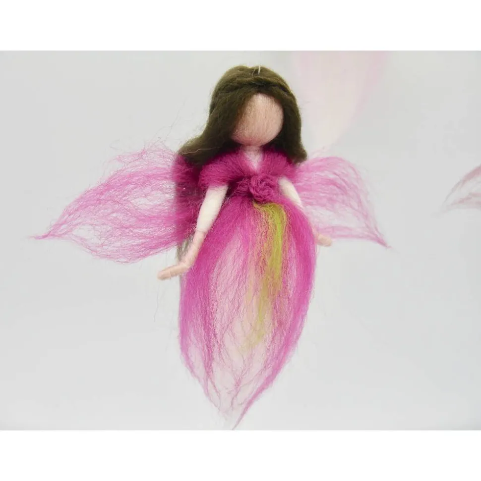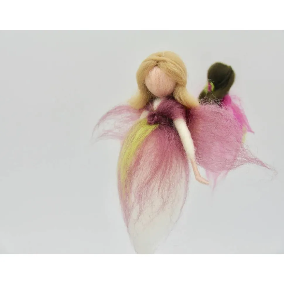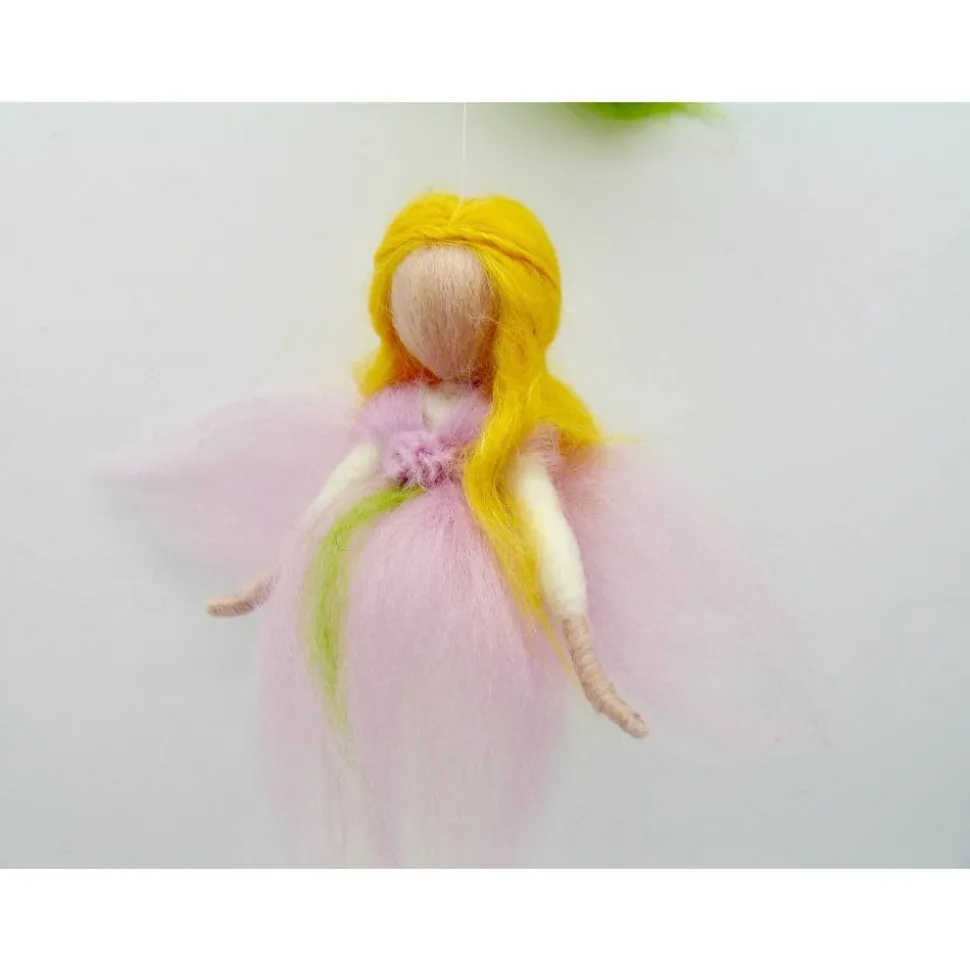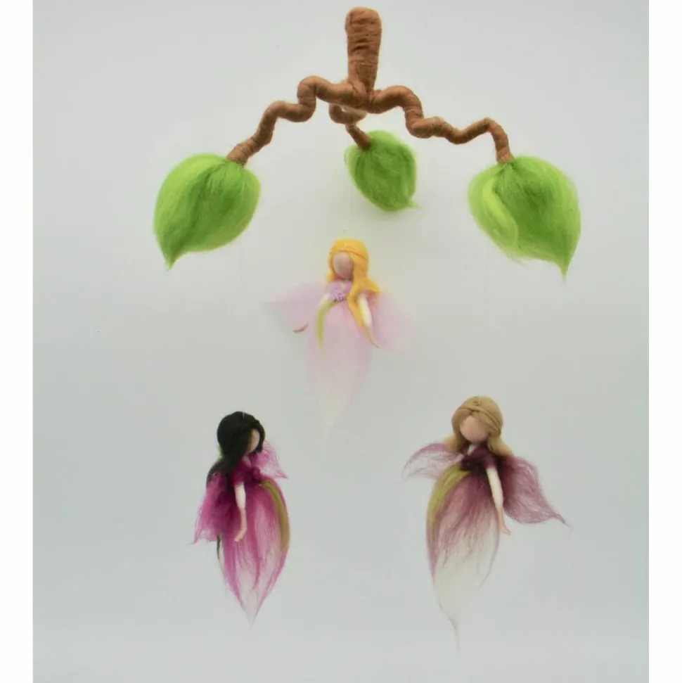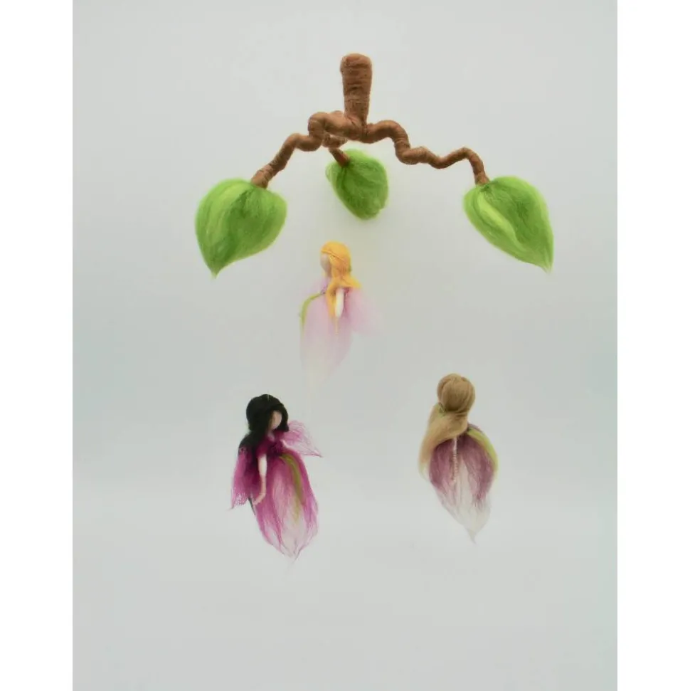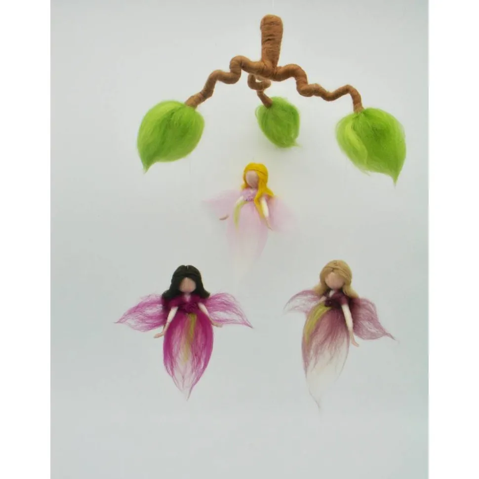 ein wunderschönes zartes Mobile gefilzt aus Märchenwolle. Die kleinen Feen tanzen und drehen sich im Feenreigen. Das Mobile ist ca 25 cm breit und 35 cm lang. Der Ast ist mit Draht verstärkt und kann noch leicht in andere Postionen gebogen werden. Gerne kann das Mobile auch in anderen Farbtönen angefertigt werden – bei Wünschen einfach melden.