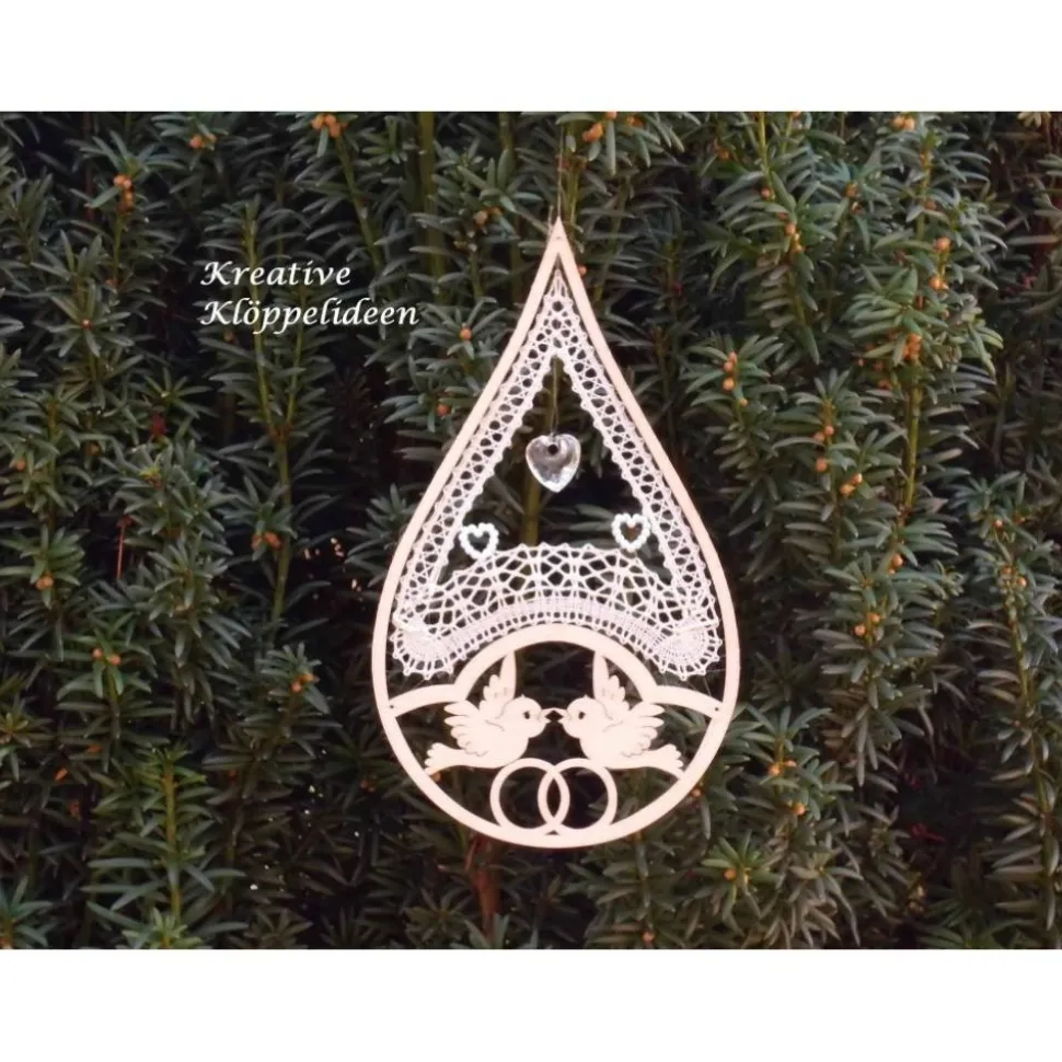Passend zu einem tropfenförmige Rahmen aus Holz mit Hochzeitsmotiv, den ich vor eigener Zeit in einem Geschäft für Klöppelzubehör kaufte, entwarf ich ein Klöppelmuster in Chrysanthetechnik und klöppelte es dann. Die fertige Klöppelarbeit nähte ich mit einem fast unsichtbaren Polyamidfaden in den Rahmen ein. Auch zwei kleine, herzförmige Perlenringe aus Plastik nähte ich in das Klöppelbild ein.