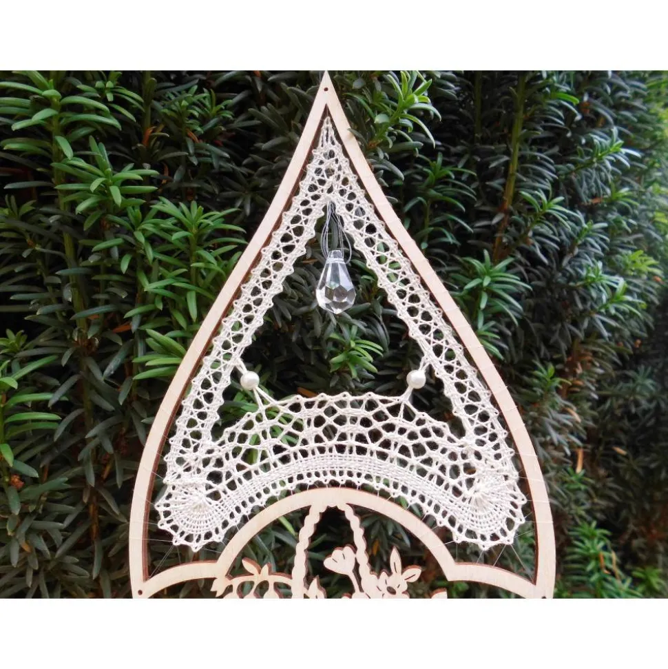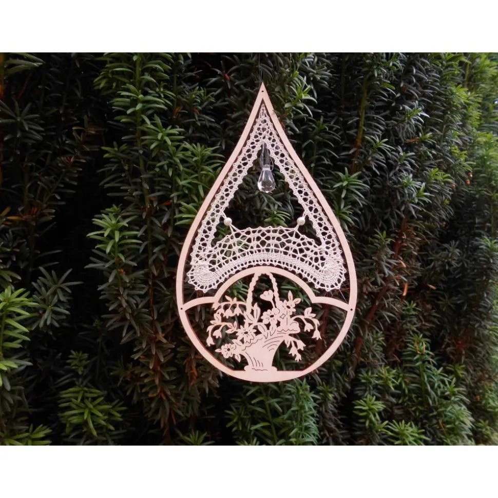 Zum Aufhängen des Klöppelbildes im Fenster ist oben am Tropfen ein dünner Faden angebracht.
