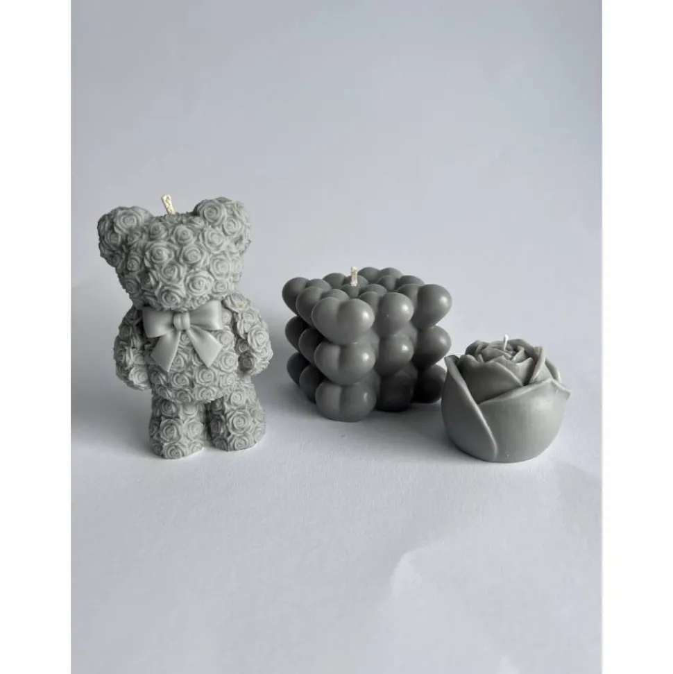 Teddybär-Kerze: Ein süßer Bär, der komplett aus kleinen Rosenblüten besteht.