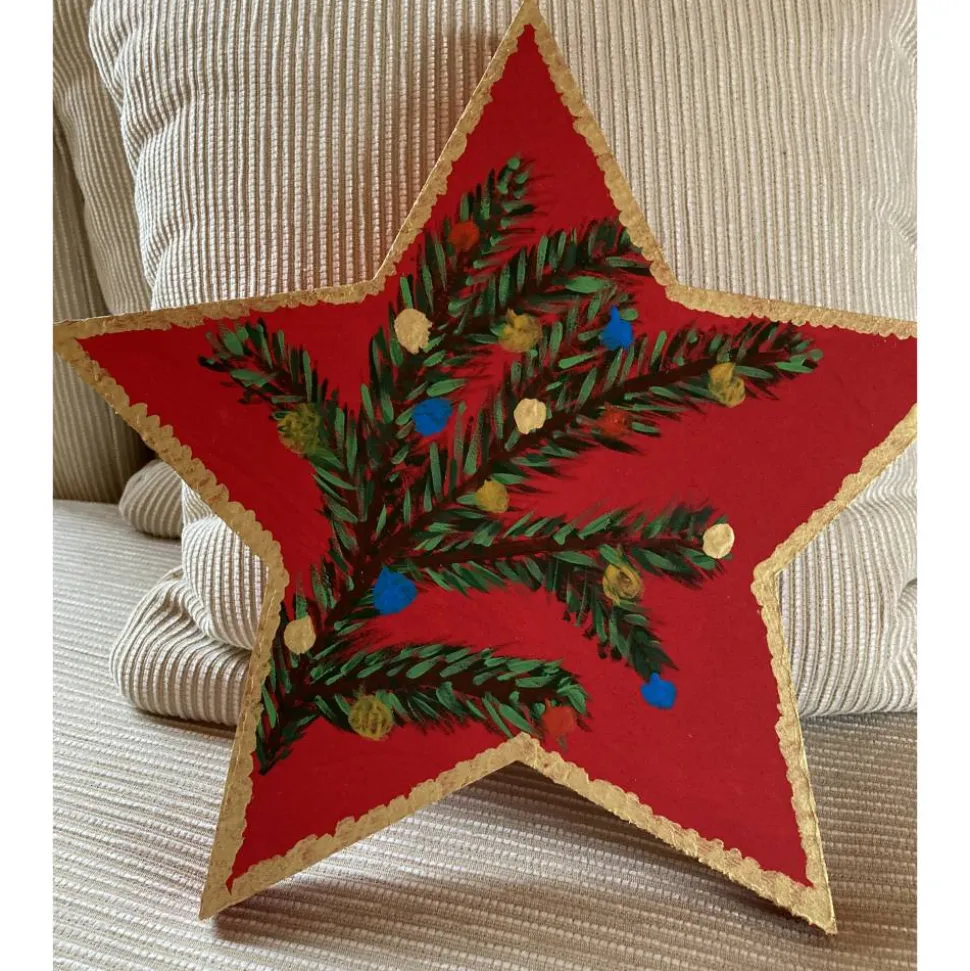 Holzstern, wasserfeste Acrylfarben in rot, grün, braun, blau und gold.