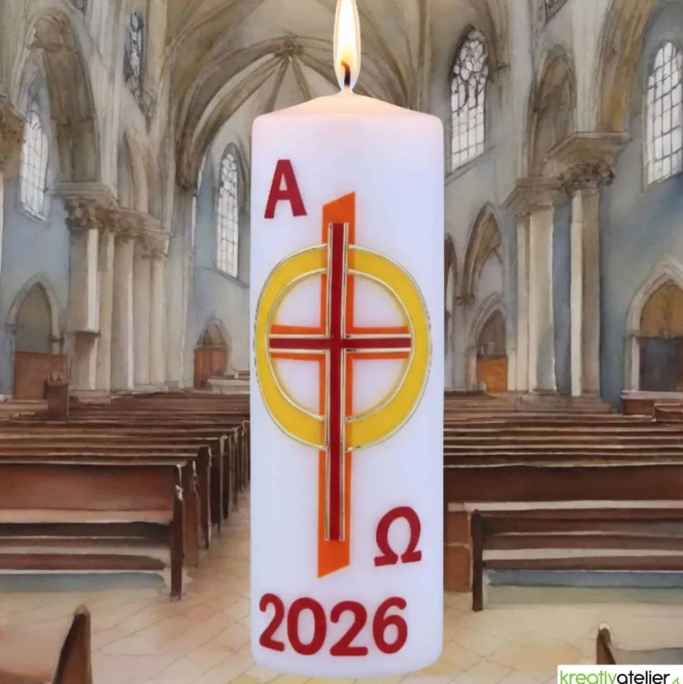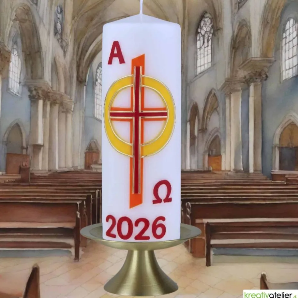 Feiern Sie Ostern mit dieser festlichen Osterkerze, die mit einem rot-orangen Kreuz und einem leuchtenden gelben Kreis mit goldenem Rand geschmückt ist. Bringen Sie damit die Botschaft der Auferstehung in Ihr Zuhause oder in Ihre Kirchengemeinde.