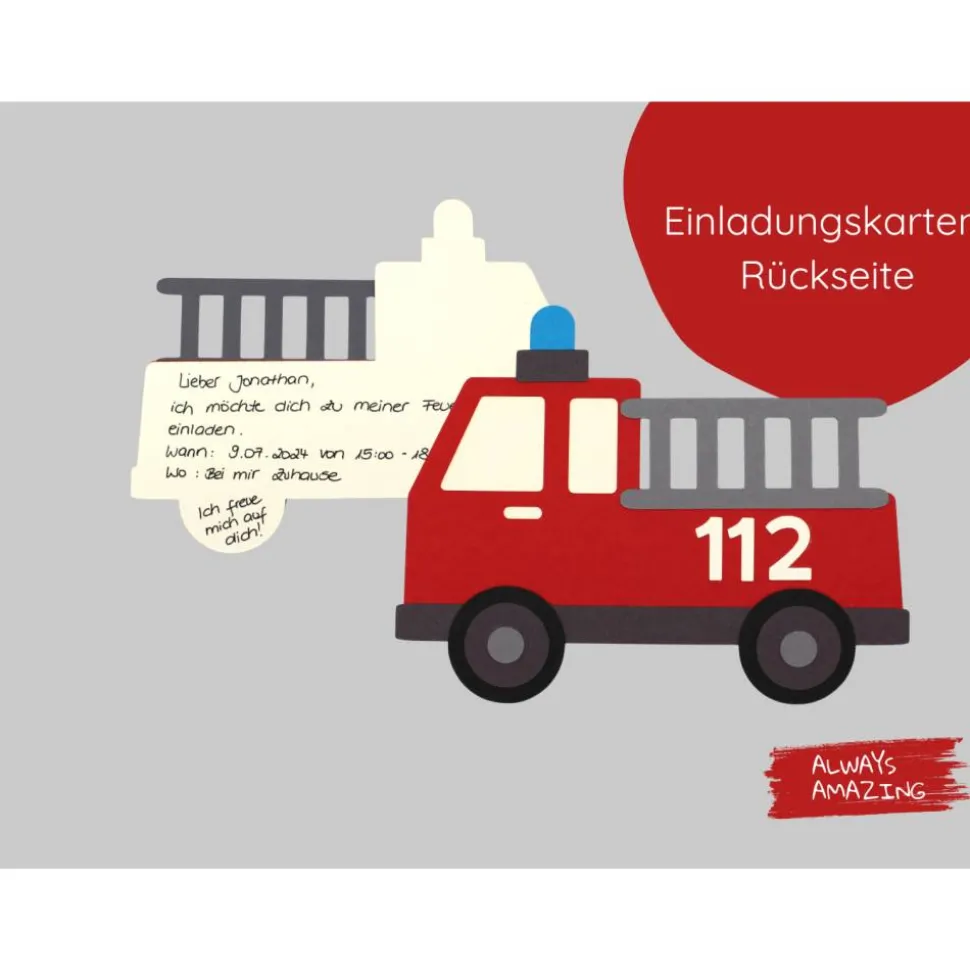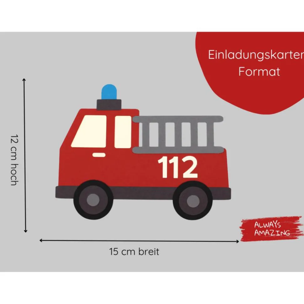 Maße Einladungskarte Feuerwehrauto: ca. 15 cm breit, 12 cm hoch