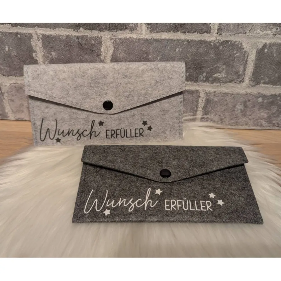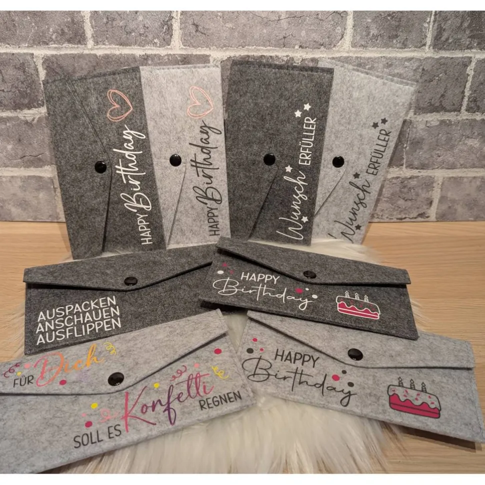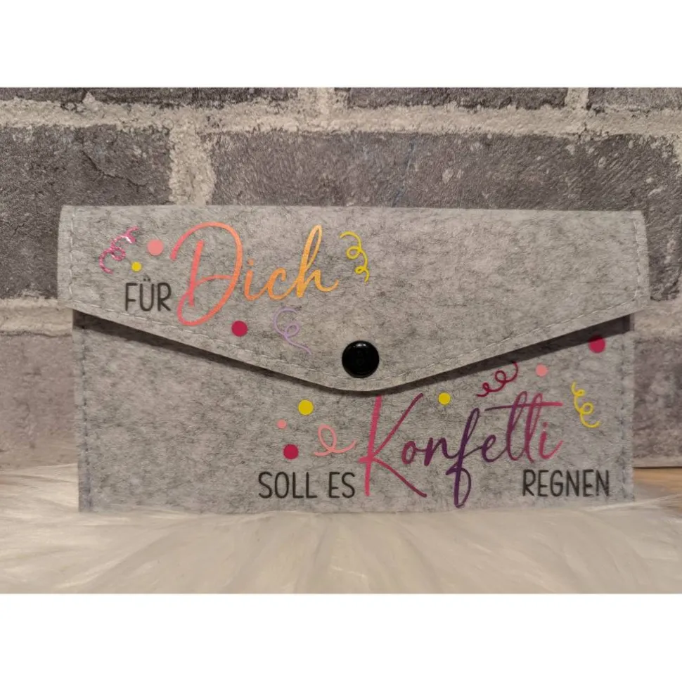 Der Umschlag besteht aus hochwertigem Filz und wird sicher mit einem Druckknopf verschlossen. Wähle zwischen hellgrau oder anthrazit als Farbe und entscheide dich für verschiedene Motive und Sprüche. Auf Wunsch erhältst du auch personalisierte Designs – individuell mit Namen, Datum oder einem persönlichen Spruch gestaltet. Schreibe deine Wünsche einfach bei der Bestellung dazu!