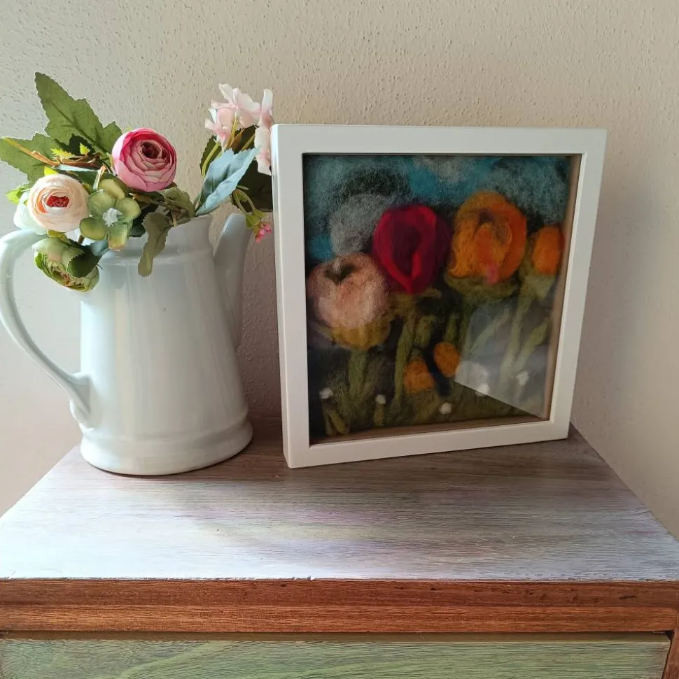 Für jemanden, der sich an der Filzkunst erfreuen kann, habe ich hier eine handgefilzte 3-D- Blumen in eine Filzwiese eingebettet und in den Rahmen eingepasst!
