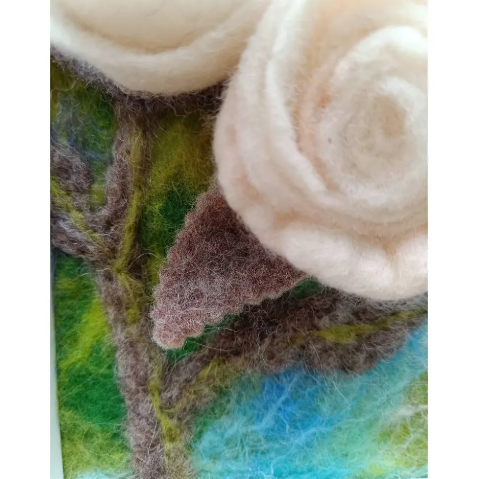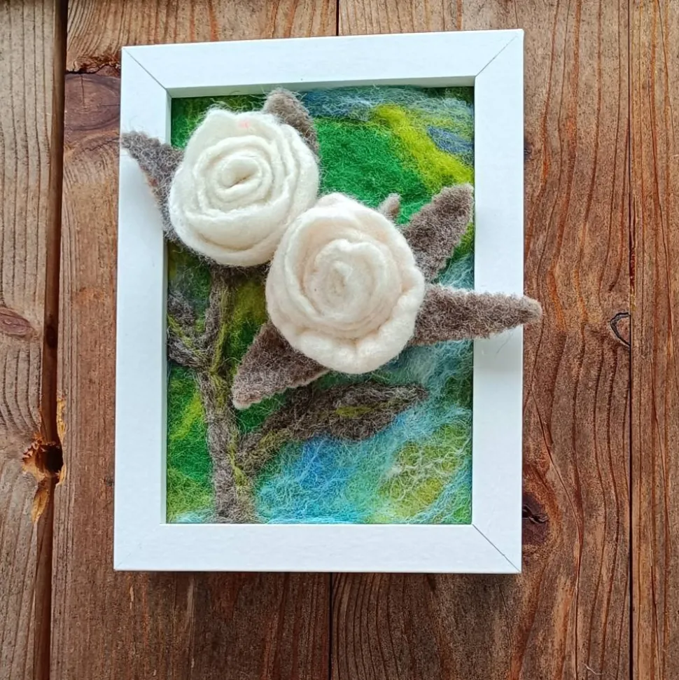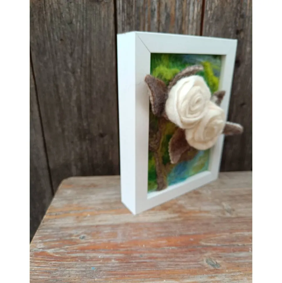 Für jemanden, der sich an der Filzkunst erfreuen kann, habe ich hier handgefilzte weiße 3-D-Rosen in eine Filzlandschaft eingebettet und in den Rahmen eingepasst!