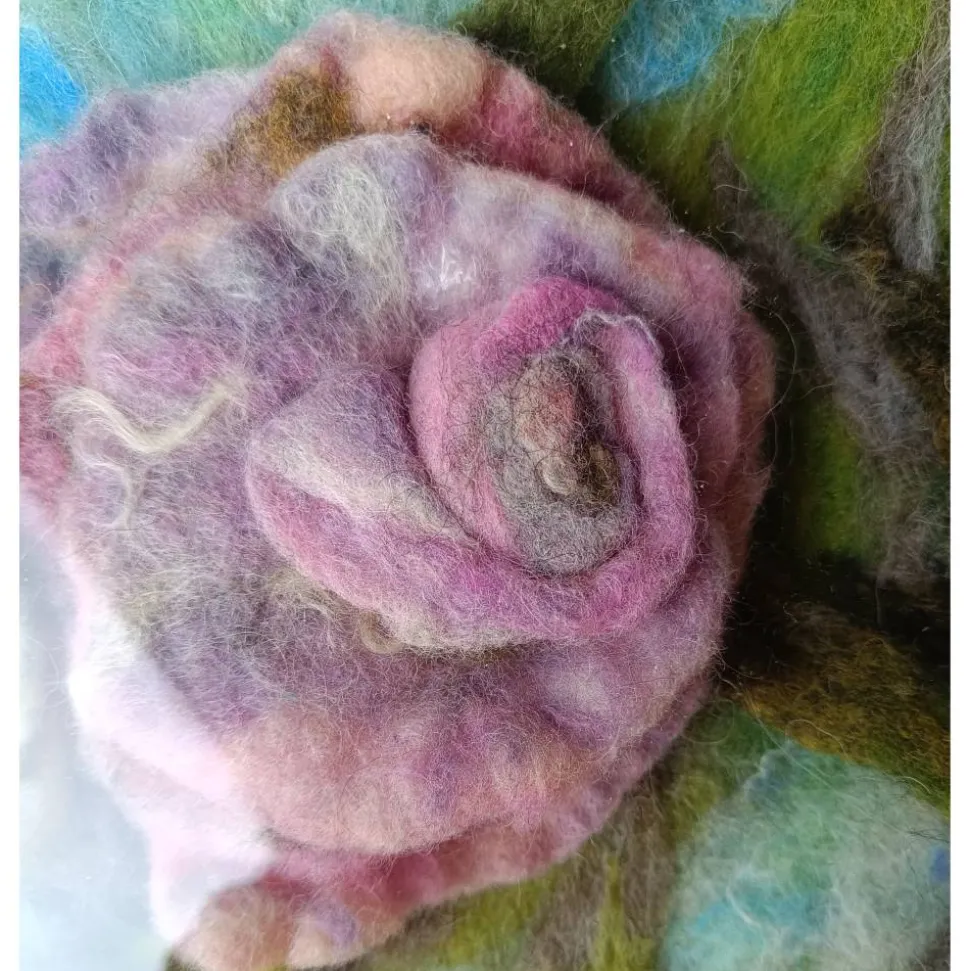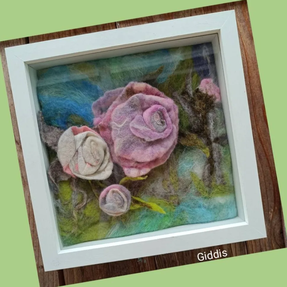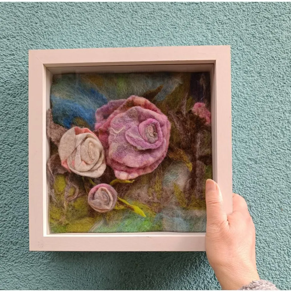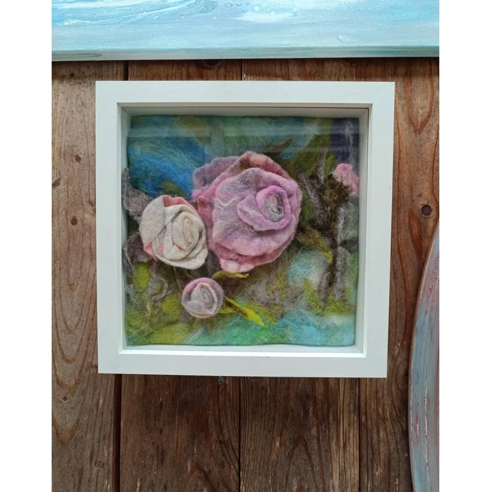 Für jemanden, der sich an der Filzkunst erfreuen kann, habe ich hier handgefilzte 3-D-Rosen in eine Filzlandschaft eingebettet und in den Rahmen eingepasst!