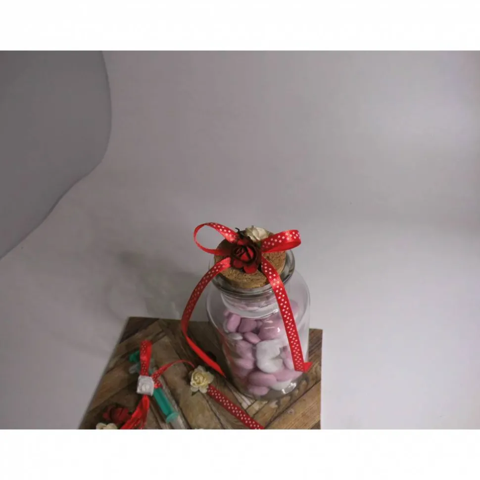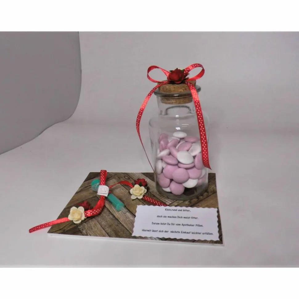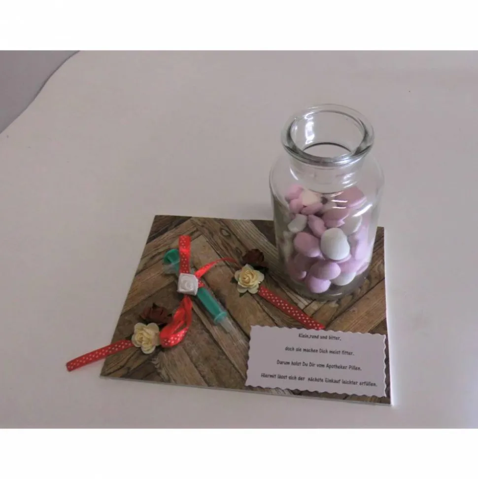 Nach dem Ausgeben des Gutscheins bleibt die liebevoll gestaltete Deko als Erinnerung an den Ehrentag erhalten. Du erhältst einen Malkarton, beklebt mit Parkettmotivpapier, dekoriert mit einer kleinen Plastikspritze. Dazu gibt es ein Glas mit Korkdeckel, das ich persönlich mit etwa 100 Gramm frischen Schokolinsen fülle – eine süße Nervennahrung für turbulente Zeiten. Die Schokolinsen werden immer frisch gekauft, sobald Du den Artikel bestellst.