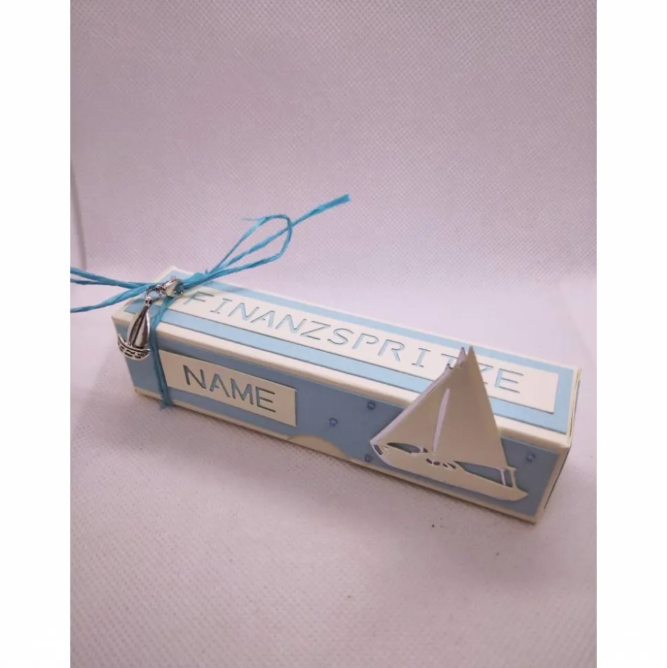 Gebastelt habe ich hier aus Leinenkarton eine cremefarbene Box zum aufklappen. Sie ist dekoriert mit hellbauem Leinenkarton. Als Motiv ist eine weißes/silberfarbenes Schiff aufgesetzt. In dieser Box befindet sich eine Packungsbeilage (auf witzige Art geschrieben) sowie eine neue und unbenutzte 6 ml Spritze für den Geldschein.