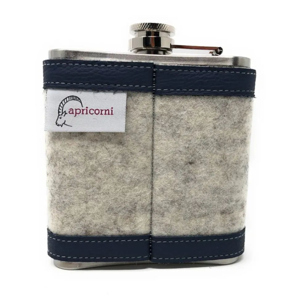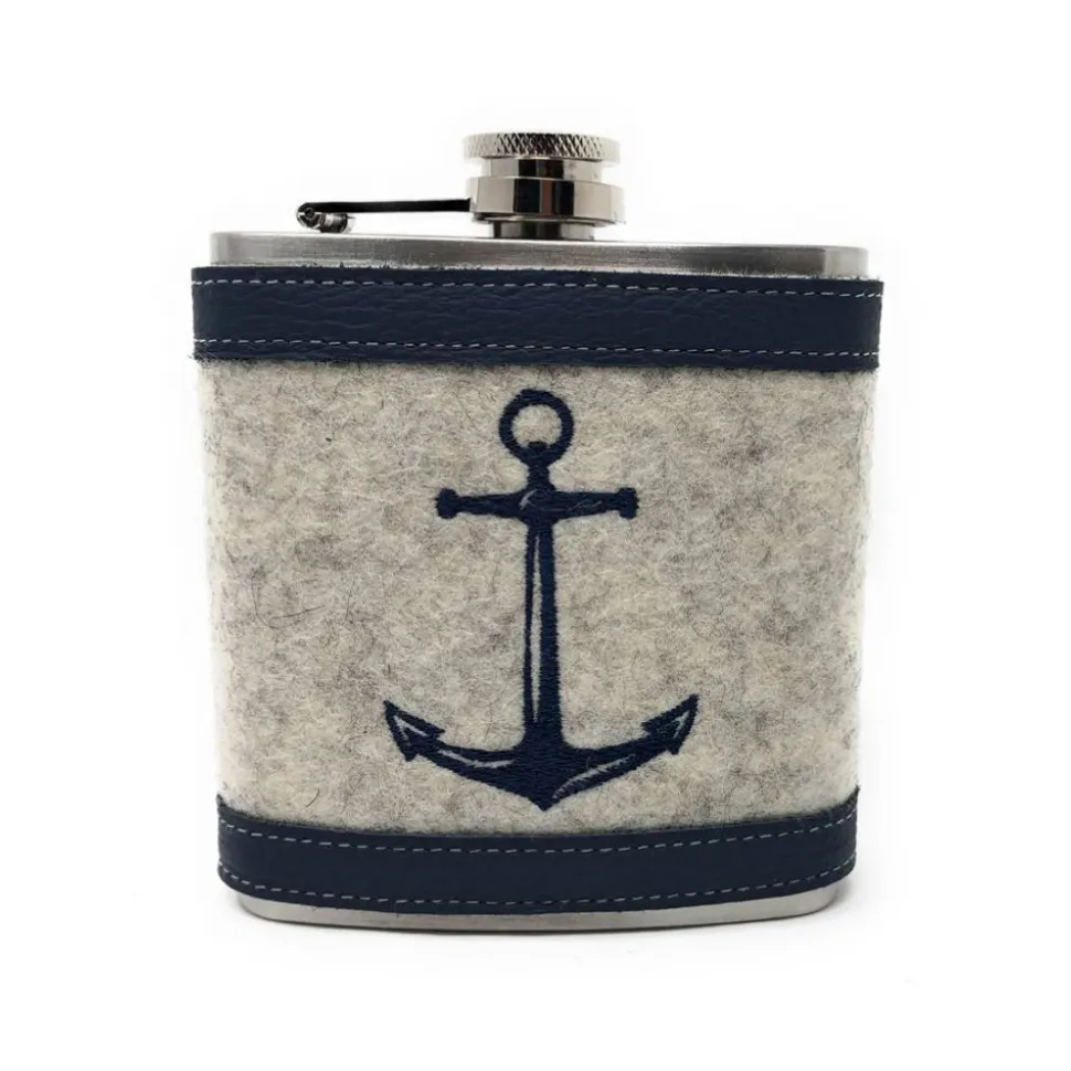Der hier abgebildete, hellgrau-melierte Wollfilz passt perfekt zum dunkelblauen Leder und dem dunkelblauen Anker. Ergänzt wird der Flachmann durch einen mitgelieferten Trichter, mit dem sich die Flüssigkeit einfacher einfüllen läßt, sowie einer mit schwarzem Satin ausgeschlagenen Geschenkbox.