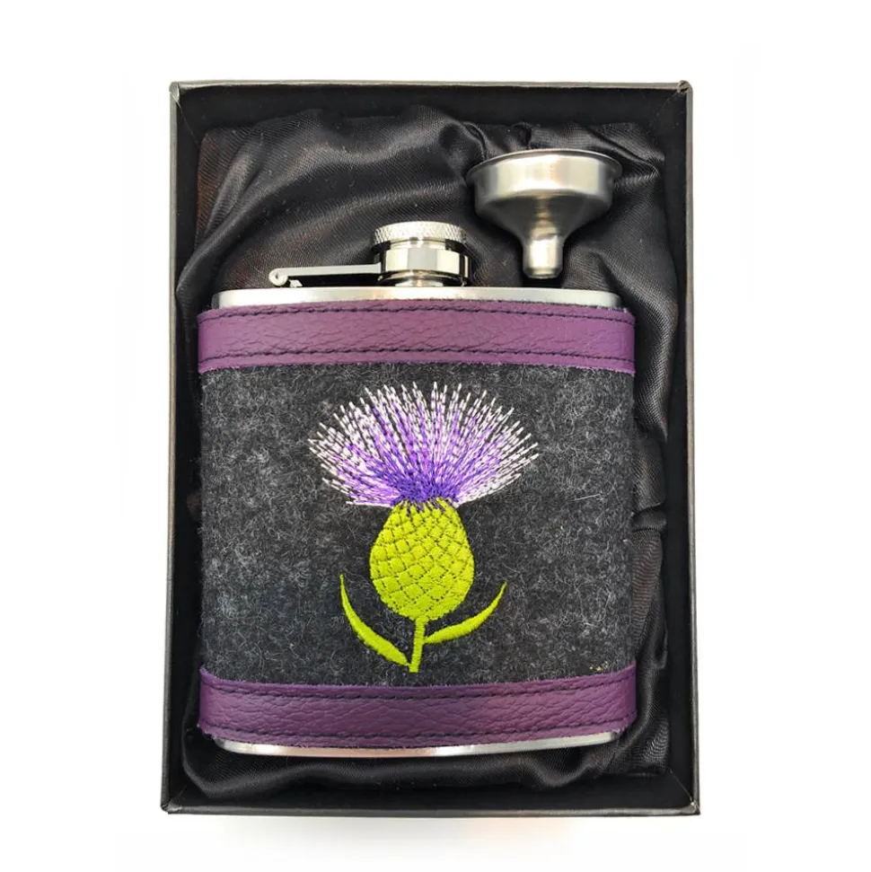 Der hier abgebildete, anthrazitfarbene Wollfilz passt perfekt zum lilafarbenem Leder und der schottischen Distel. Ergänzt wird der Flachmann durch einen mitgelieferten Trichter, mit dem sich die Flüssigkeit einfacher einfüllen läßt, sowie einer mit schwarzem Satin ausgeschlagenen Geschenkbox.