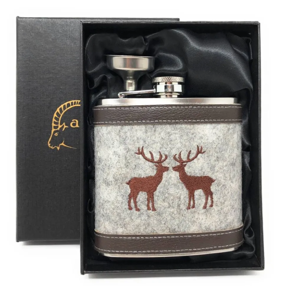 Der hier abgebildete, grau-melierte Wollfilz passt perfekt zum dunkelbraunen Leder und den dunkelbraunen Hirschen. Ergänzt wird der Flachmann durch einen mitgelieferten Trichter, mit dem sich die Flüssigkeit einfacher einfüllen läßt, sowie einer mit schwarzem Satin ausgeschlagenen Geschenkbox.