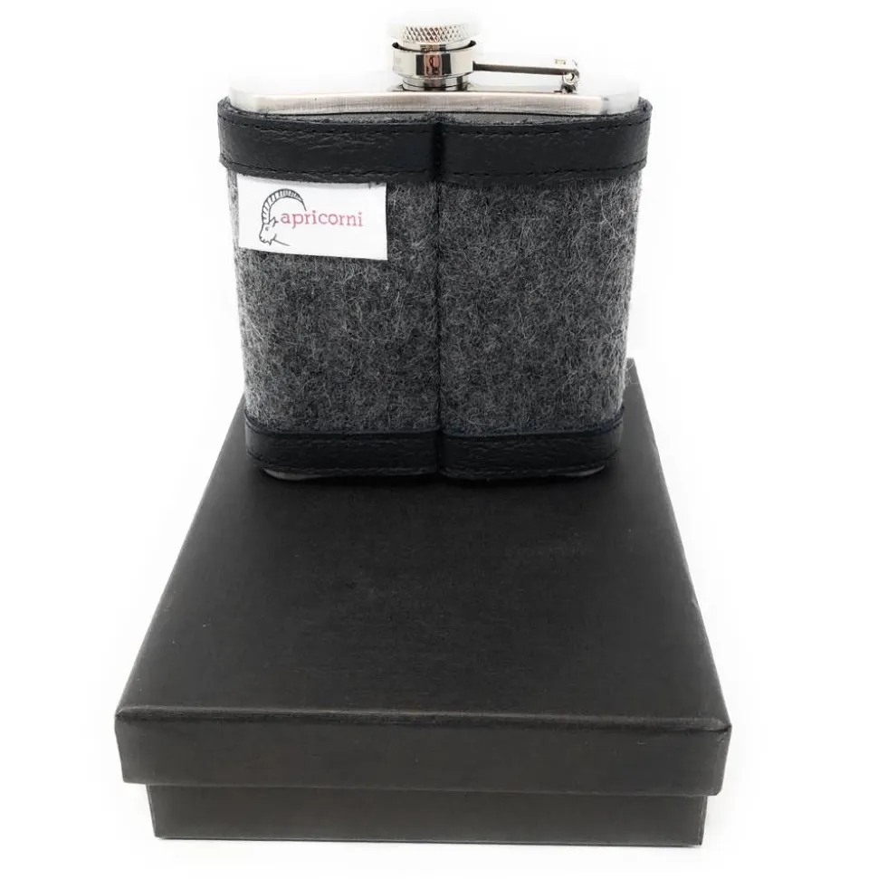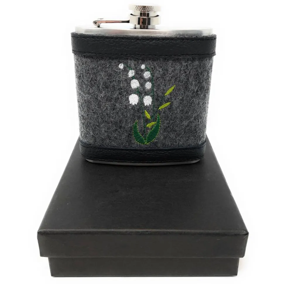 Der hier abgebildete, dunkelgrau-melierte Wollfilz passt perfekt zum schwarzen Leder und dem weiß-grünem Maiglöckchen. Ergänzt wird der Flachmann durch einen mitgelieferten Trichter, mit dem sich die Flüssigkeit einfacher einfüllen läßt, sowie einer mit schwarzem Satin ausgeschlagenen Geschenkbox.