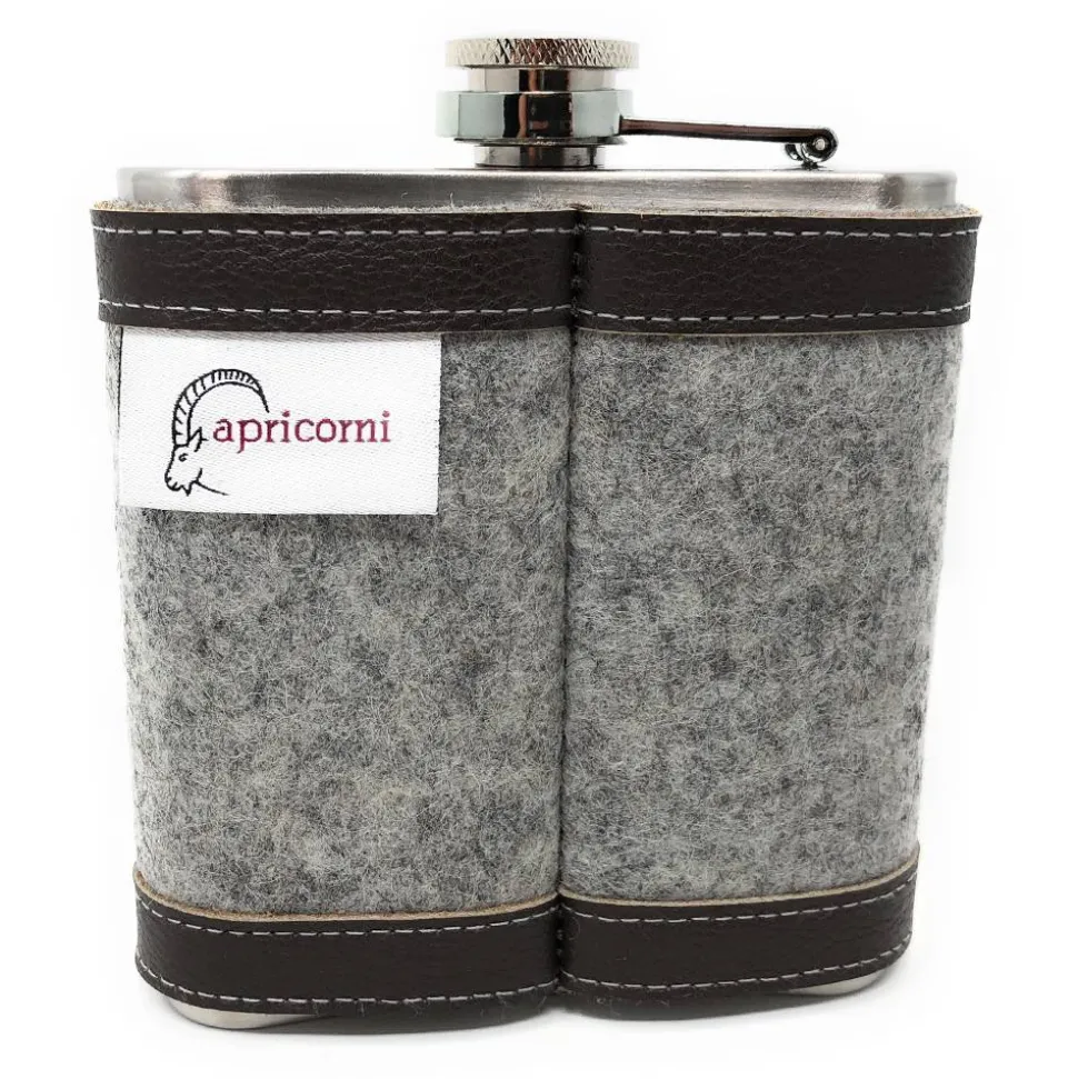 Der hier abgebildete, grau-melierte Wollfilz passt perfekt zum dunkelbraunen Leder und den dunkelbraunen Steinböcken. Ergänzt wird der Flachmann durch einen mitgelieferten Trichter, mit dem sich die Flüssigkeit einfacher einfüllen läßt, sowie einer mit schwarzem Satin ausgeschlagenen Geschenkbox.
