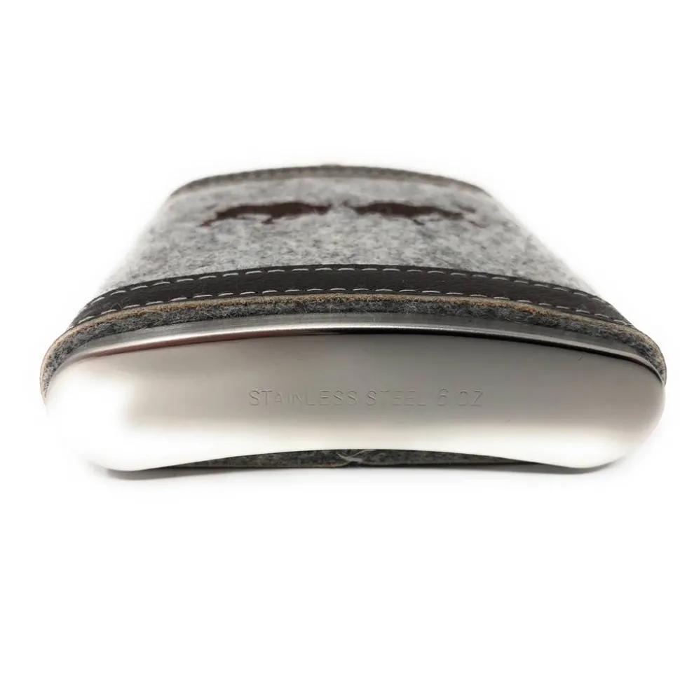 Der hier abgebildete, grau-melierte Wollfilz passt perfekt zum dunkelbraunen Leder und den dunkelbraunen Stieren. Ergänzt wird der Flachmann durch einen mitgelieferten Trichter, mit dem sich die Flüssigkeit einfacher einfüllen läßt, sowie einer mit schwarzem Satin ausgeschlagenen Geschenkbox.