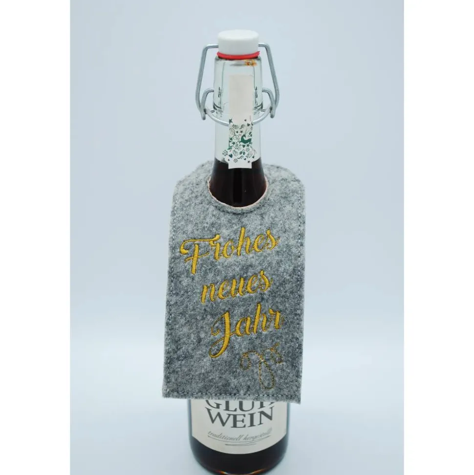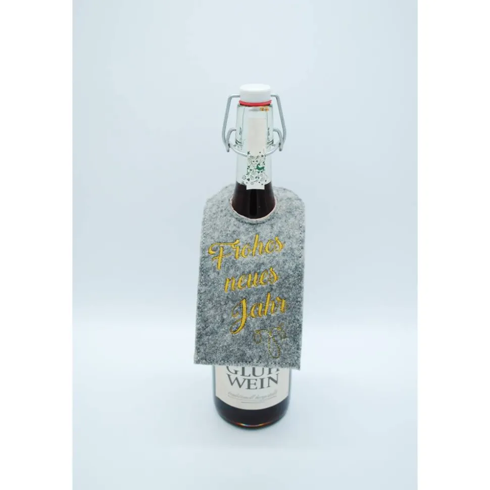 Für gängige Flaschen geeignet, wie man sieht, auch für Bügelhalsflaschen. Die Filzfarbe kann gewählt werden, es ist hellgrau meliert (3 mm), dunkelgrau meliert (3 mm) und beige meliert (2 mm) möglich. Auf Nachfrage wären auch noch folgende Stickfilz-Farben auf Lager: pink-meliert, türkis-meliert, lila meliert. Gerne kann auch etwas anderes aufgestickt werden, dann einfach vorher kurz anfragen und den Spruch bei Personalisierung angeben.