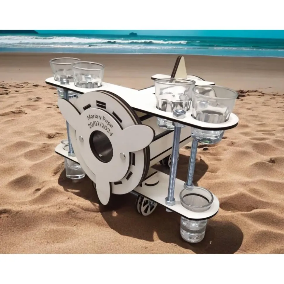 Jedes Flugzeug wird von uns einzeln handgefertigt aus lasergeschnittenen Holzplatten, hochwertigen Gewindestangen, Muttern und Schrauben. In den Tragflächen sind je nach Modell 4x4cl oder 6x4cl Schnapsgläser sicher verbaut. Dank der cleveren Steckverbindung am Propeller kommst du jederzeit einfach an die Flasche oder kannst sie nach Belieben wieder auffüllen.