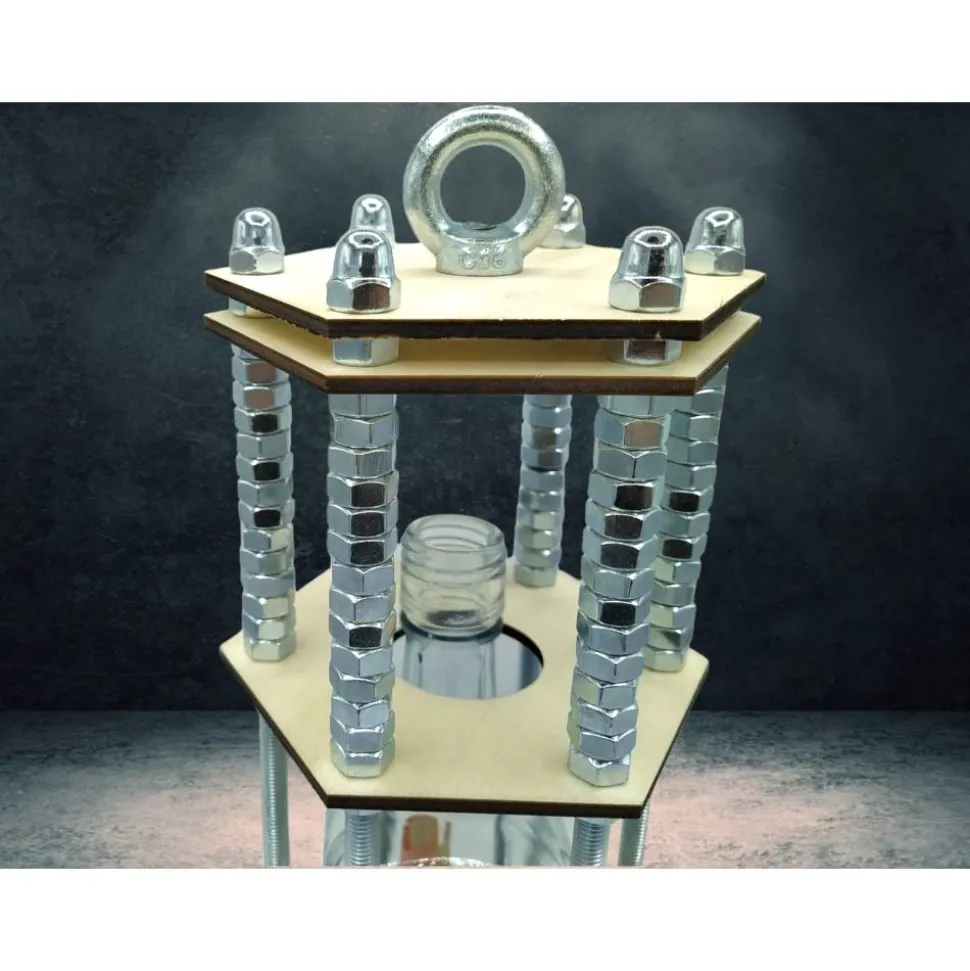 Jeder Flaschenkäfig wird von uns einzeln handgefertigt und besteht aus Lasergeschnittenen Holzplatten, Gewindestangen und über 120 Muttern.