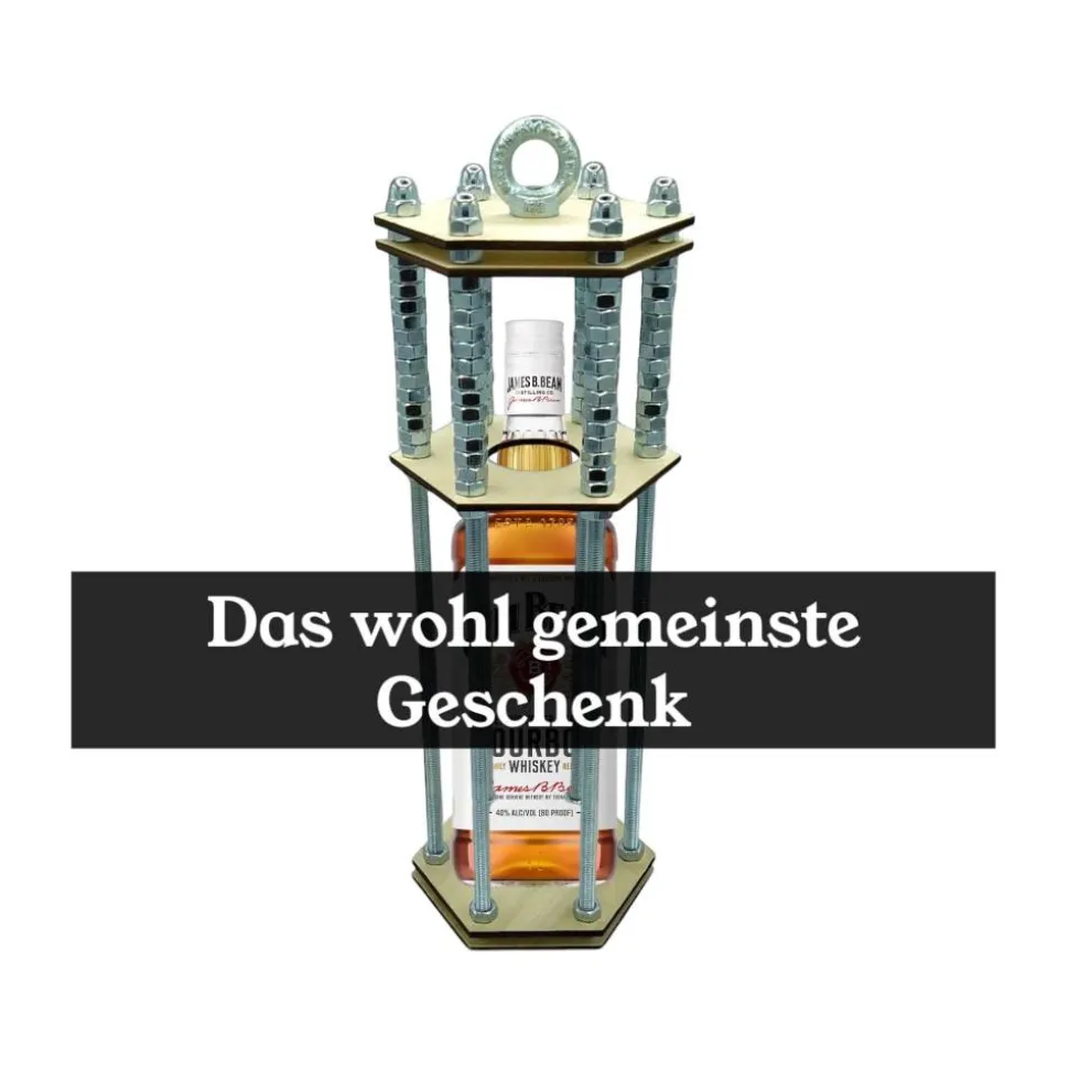 Praktische Handhabung: Du erhältst den Flaschenkäfig bereits vormontiert. Einfach deine Wunschflasche einsetzen und die Muttern aufschrauben – fertig ist das besondere Geschenk! Beachte bitte, dass wir aus rechtlichen Gründen keinen Alkohol liefern – der Flaschenkäfig kommt ohne Flasche zu dir.