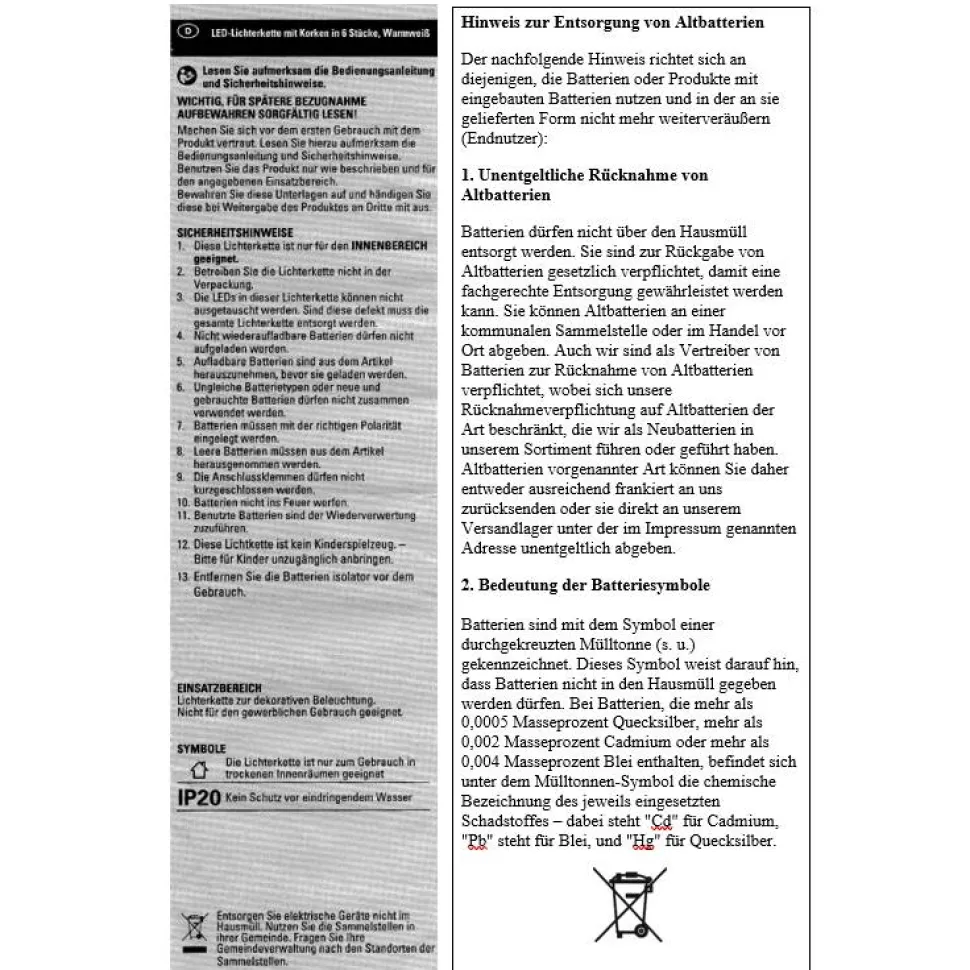 Die verwendeten Lichterketten werden von HORNBACH BAUMARKT AG nach WEEE und BattG in Deutschland registriert.