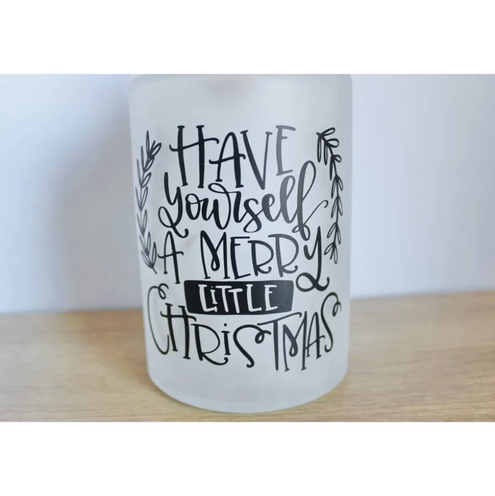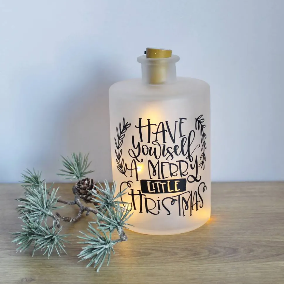 Das Motiv wird aus schwarzer Vinylfolie geschnitten und auf die Flasche aufgebracht.