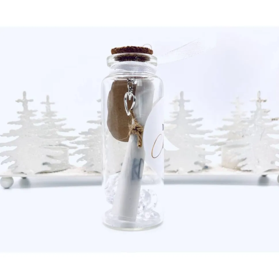 Sie Ist aus Glas und hat einen Korkverschluss in dem ein kleiner Herzanhänger steckt.