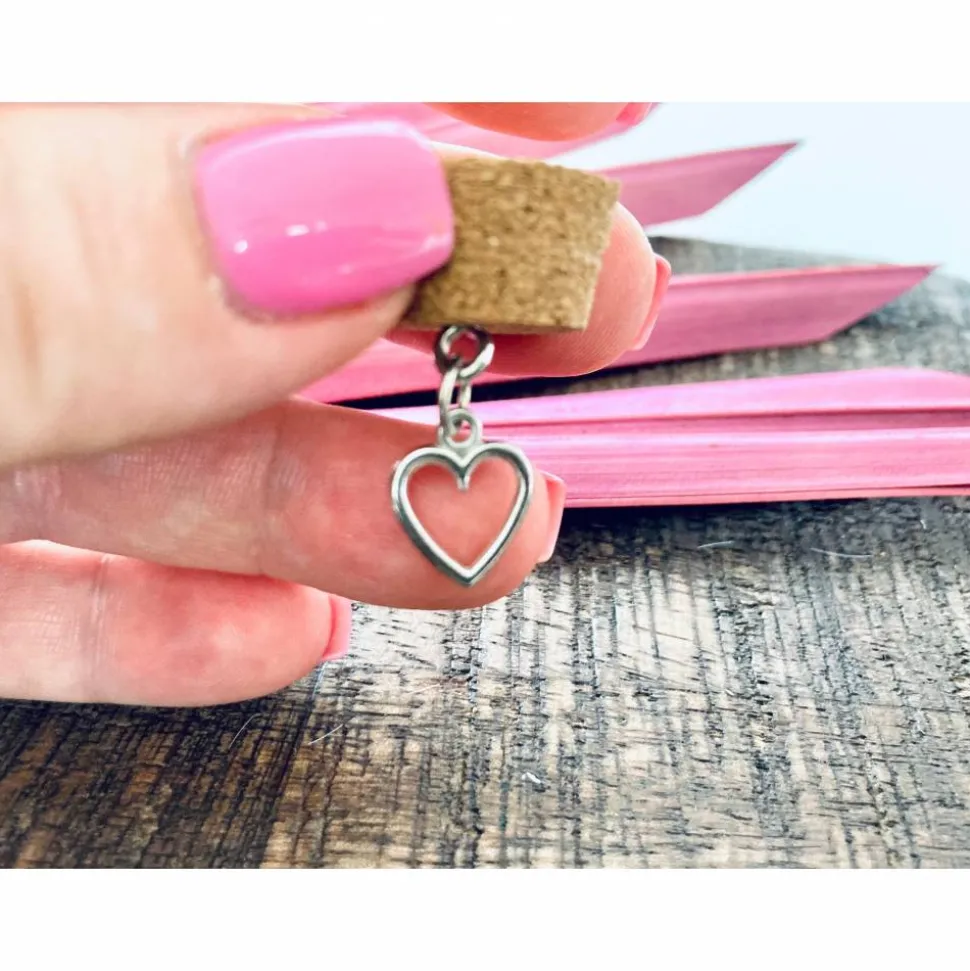 Sie ist aus Glas und hat einen Korkverschluss in dem ein kleiner Herzanhänger steckt.