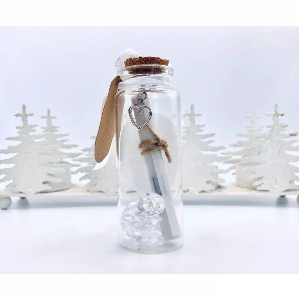 Sie Ist aus Glas und hat einen Korkverschluss in dem ein kleiner Herzanhänger steckt.