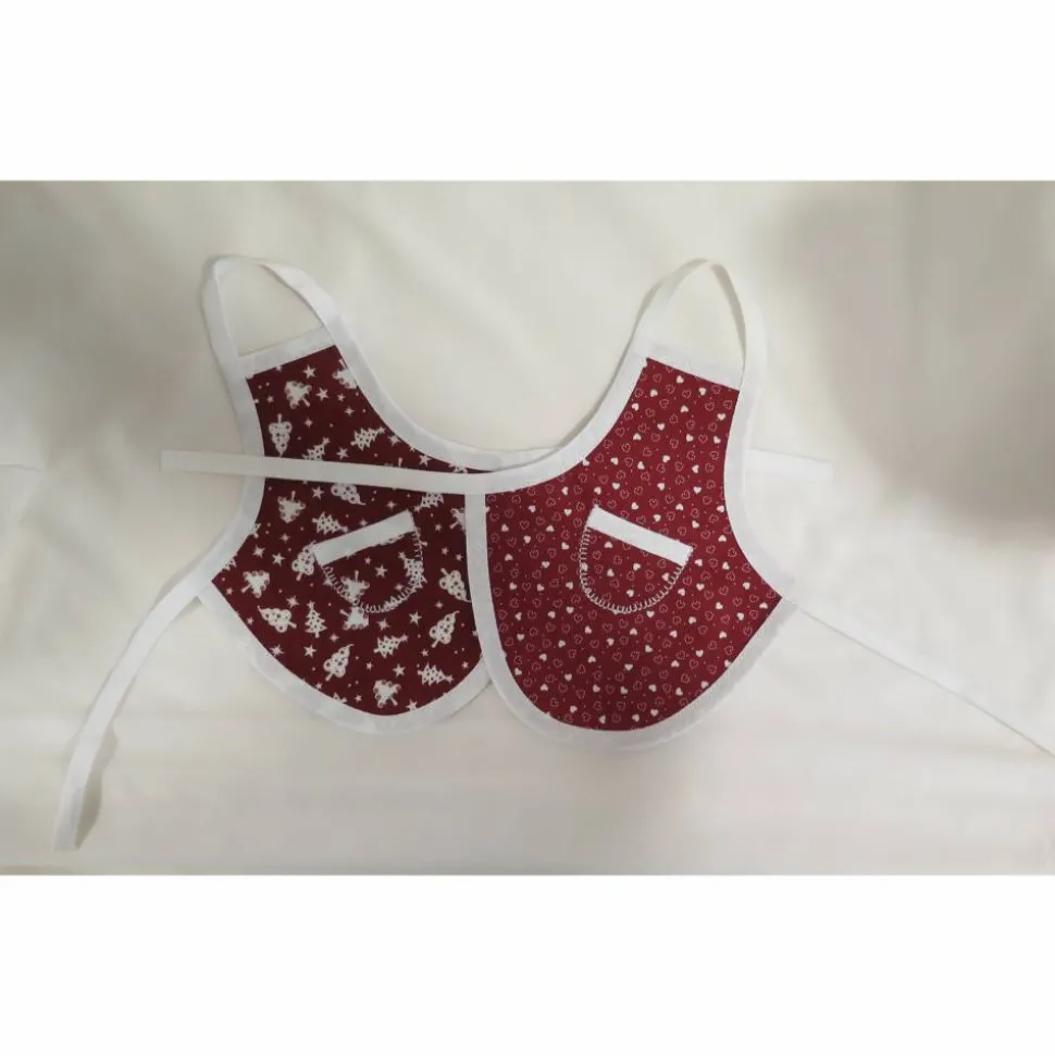 Die Grundfarbe ist rot, bedruckt mit weißen Tannenbäumen, eingefasst mit weißem Schrägband.