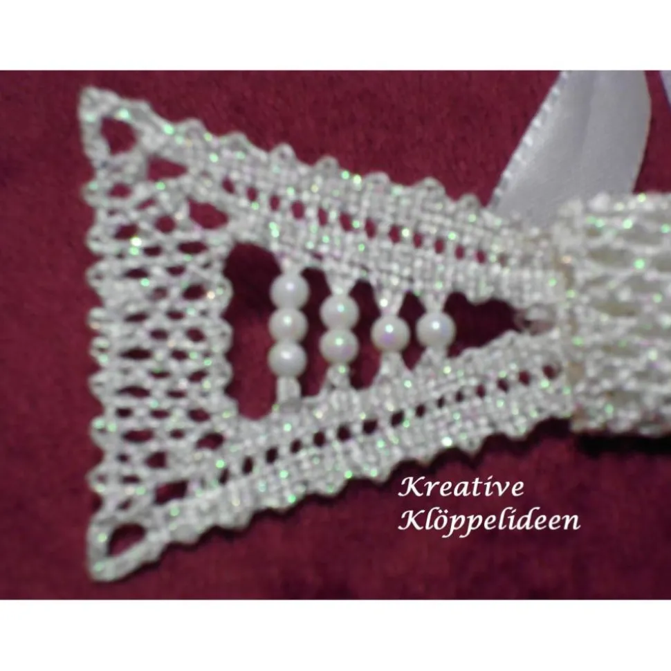 Diese Fliege habe ich mit weißem Viskosegarn, in welches ein metallisierter Polyesterfaden im Farbverlauf von silber, rosé und hellgrün eingewirkt ist, geklöppelt.