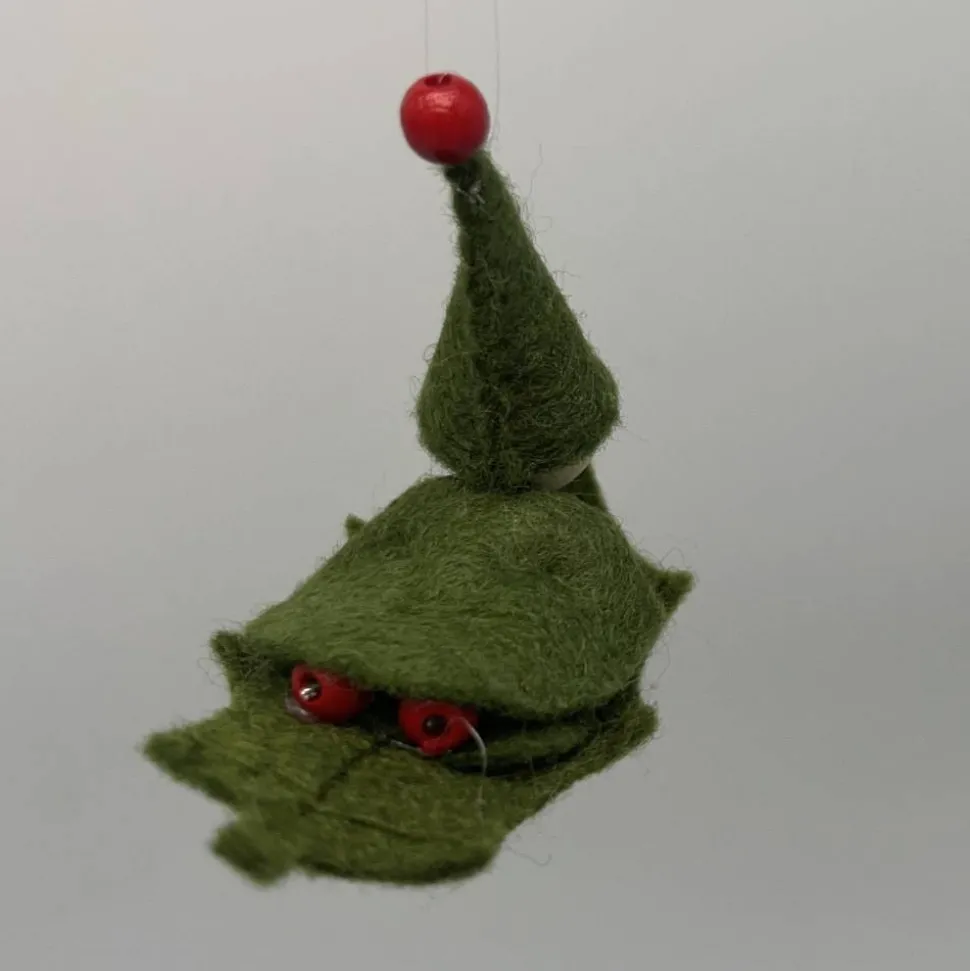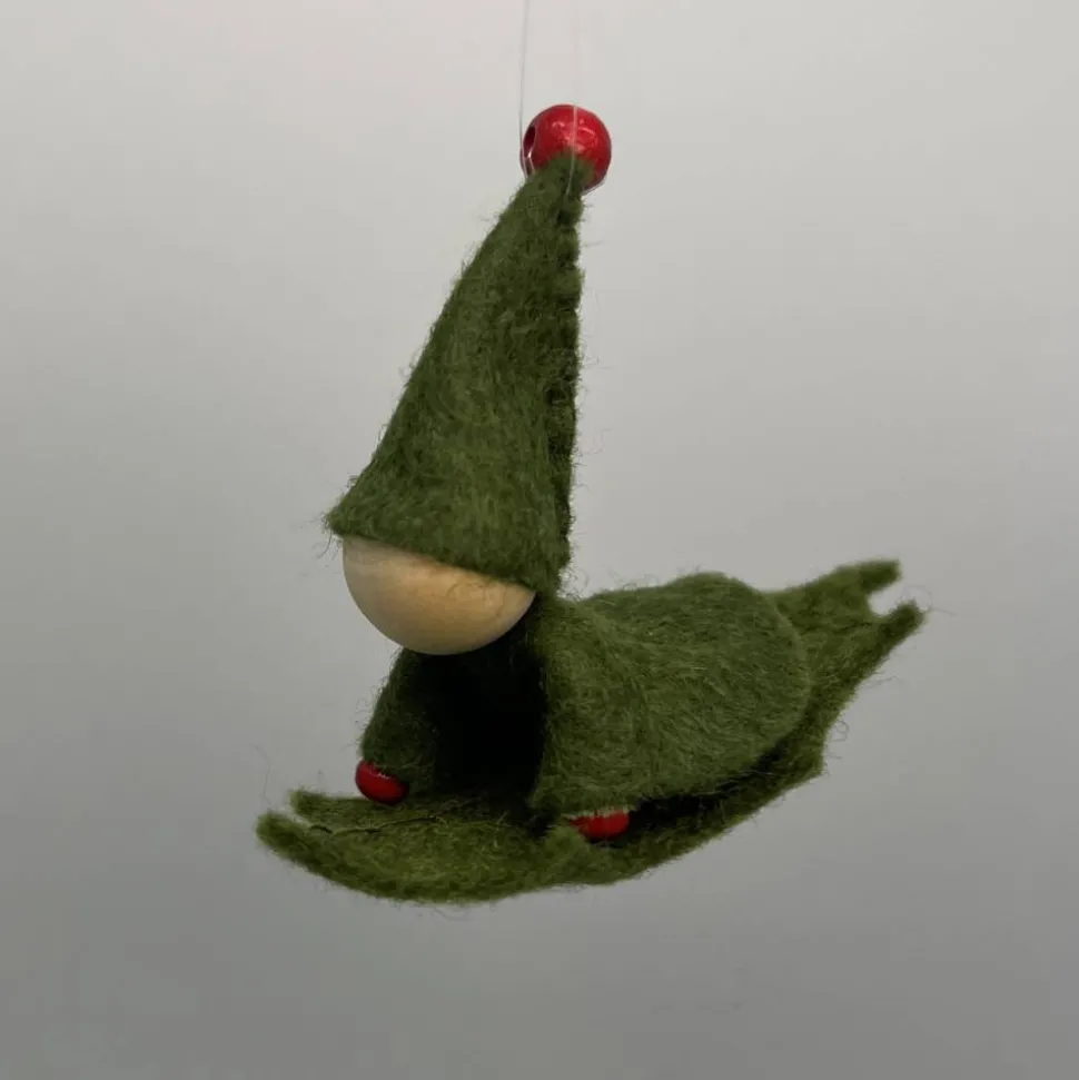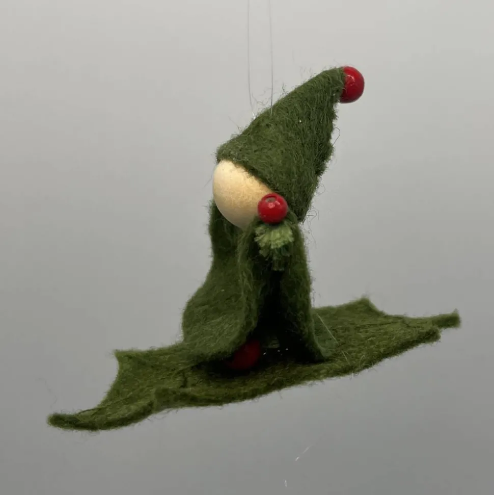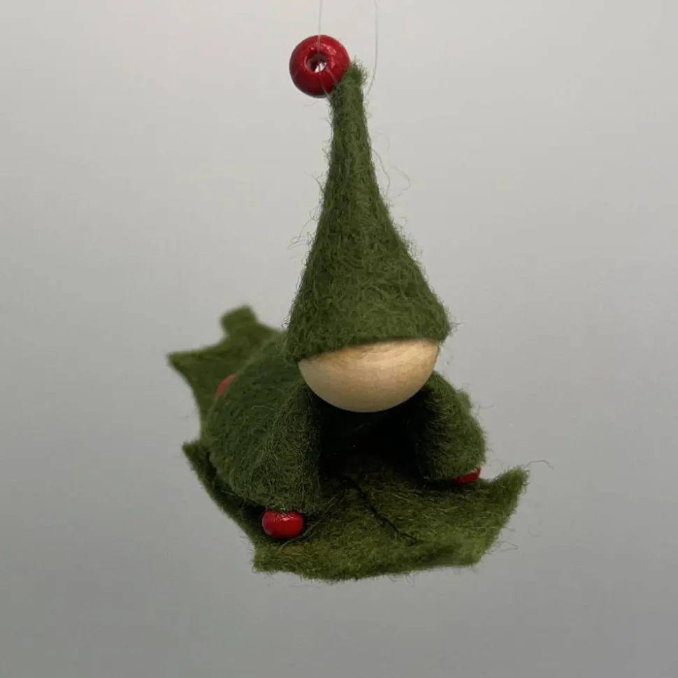 Kopf, Hände und Füße aus bunten Holzperlen, Kleid und Hut sind aus grünem Filz genäht. Das Männchen sitzt oder liegt auf einem Stechpalmenblatt aus Filz. Am Hut ist ein durchsichtiger Nylonfaden befestigt an welchen das Stechpalmenmännchen aufgehängt werden kann.