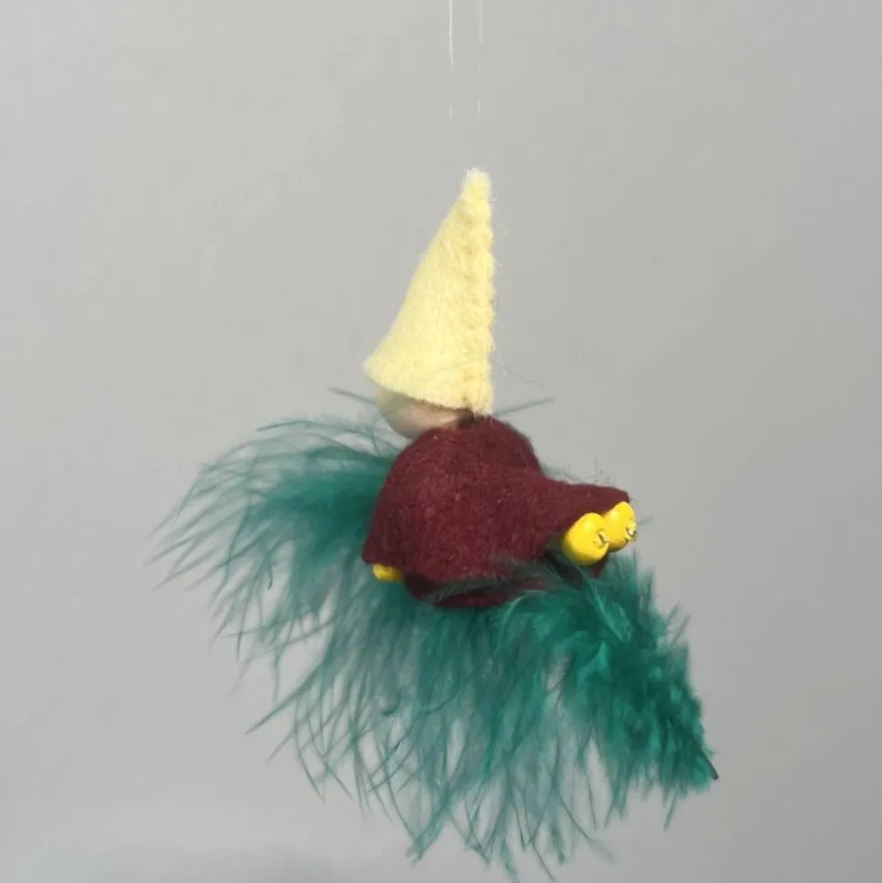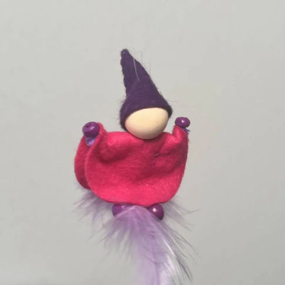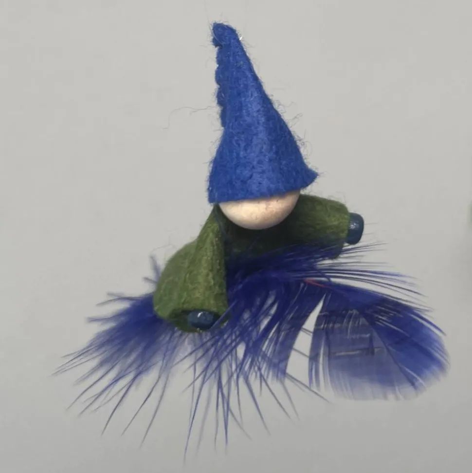 Kopf, Hände und Füße aus bunten Holzperlen, Kleid und Hut sind aus buntem Filz genäht. Das Männchen sitzt oder liegt auf einer bunten Feder. Am Hut ist ein durchsichtiger Nylonfaden befestigt an welchen das bunte Frühlingsmännchen aufgehängt werden kann.