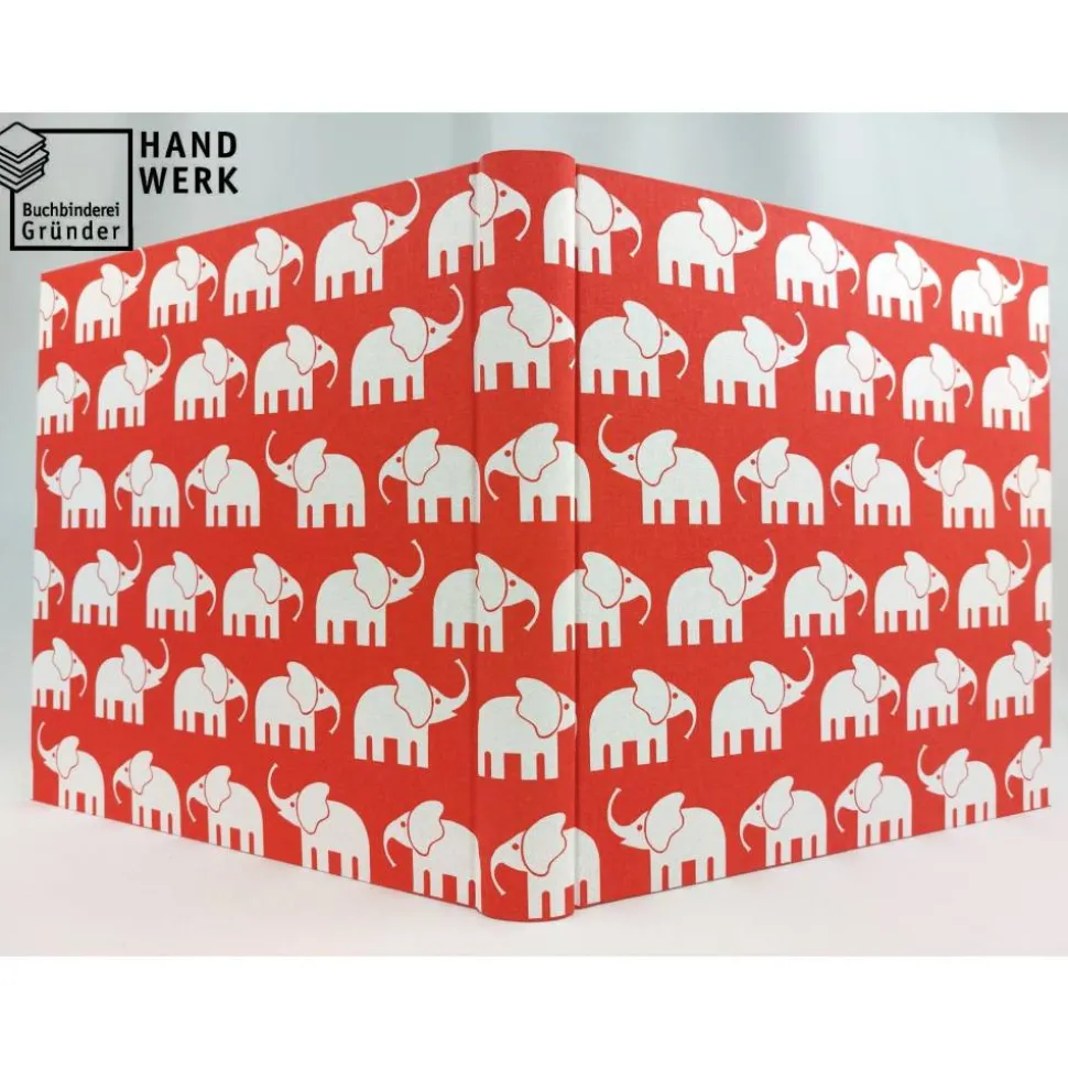 Dieses Fotoalbum ist in hellroten Baumwollstoff fest eingebunden. Über das Album wandert eine kleine weiße Elefantenherde.