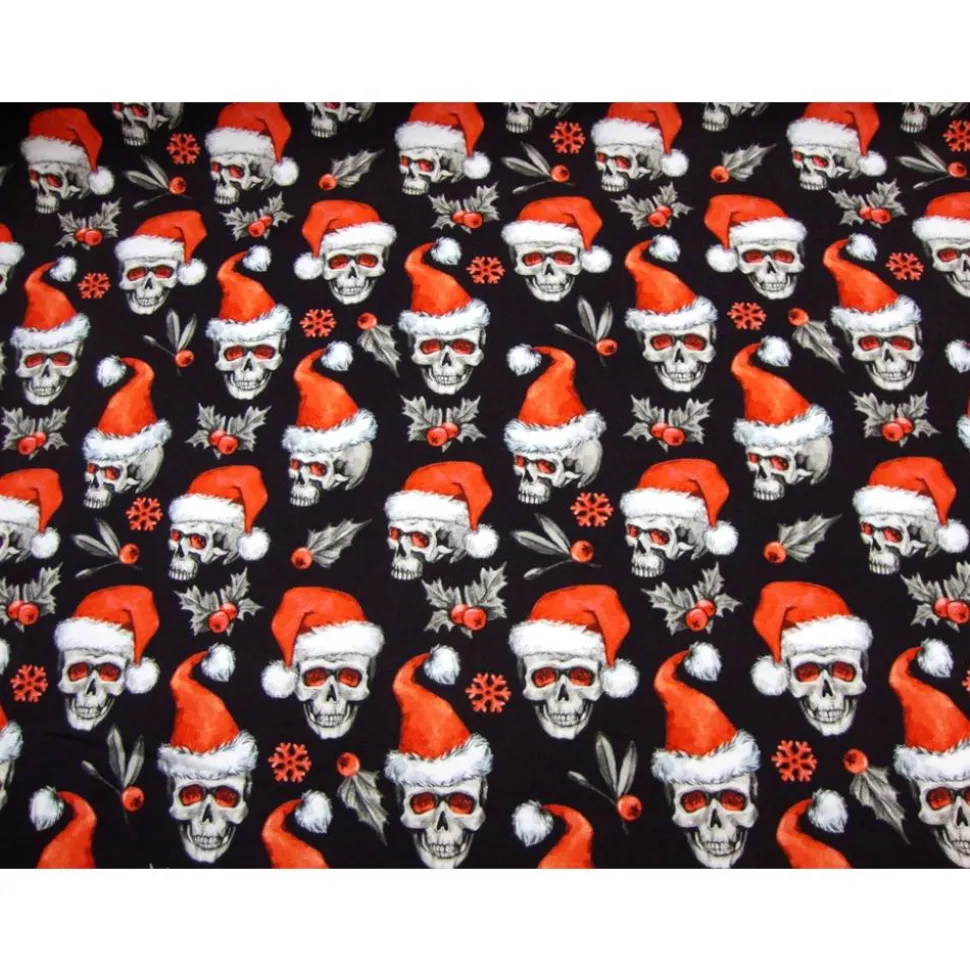 Entdecke den einzigartigen French Terry Sweat Totenkopf mit Nikolausmütze! Dieser festliche Stoff mit auffälligen Skulls und Weihnachtstotenköpfen in Rot, Weiß und Schwarz ist ein echtes Highlight für deine Nähprojekte.