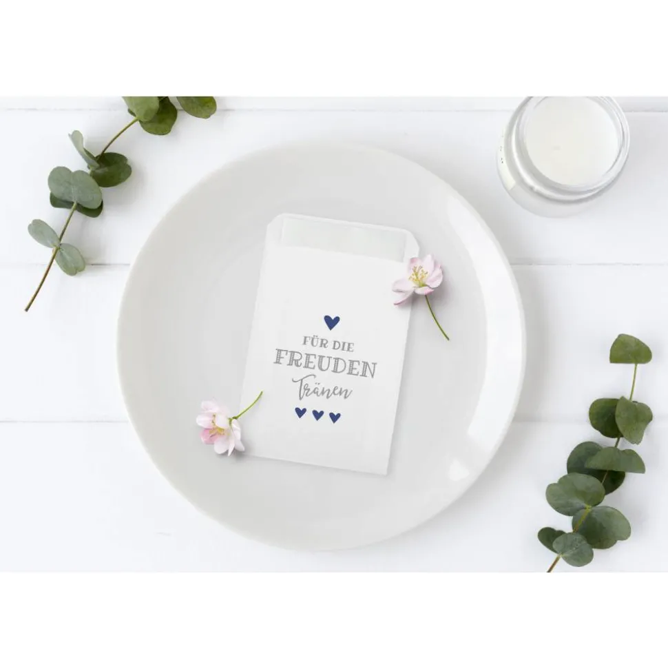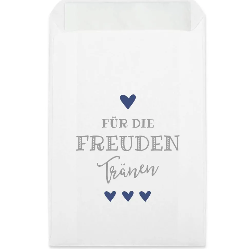 Ihr plant Eure Hochzeitsfeier und möchtet sie noch unvergesslicher gestalten? Dann haben wir die ideale Lösung für Euch! Wir stellen Euch unsere Freudentränen Hüllen vor, die mit dem Aufdruck „Für die Freudentränen“ in grau-blau versehen sind. Mit diesen Verpackungen verleiht Ihr Eurer Hochzeitsdeko eine ganz besondere Note. Bei der Planung Eurer Hochzeit sind die Details entscheidend, um Eure Feier zu etwas Besonderem zu machen. Unsere weißen Premium Flachbeutel sind eine wunderbare Ergänzung für Eure Hochzeitsdeko und ein praktisches Accessoire für Eure Gäste. WICHTIG: Lieferung erfolgt OHNE Taschentücher!