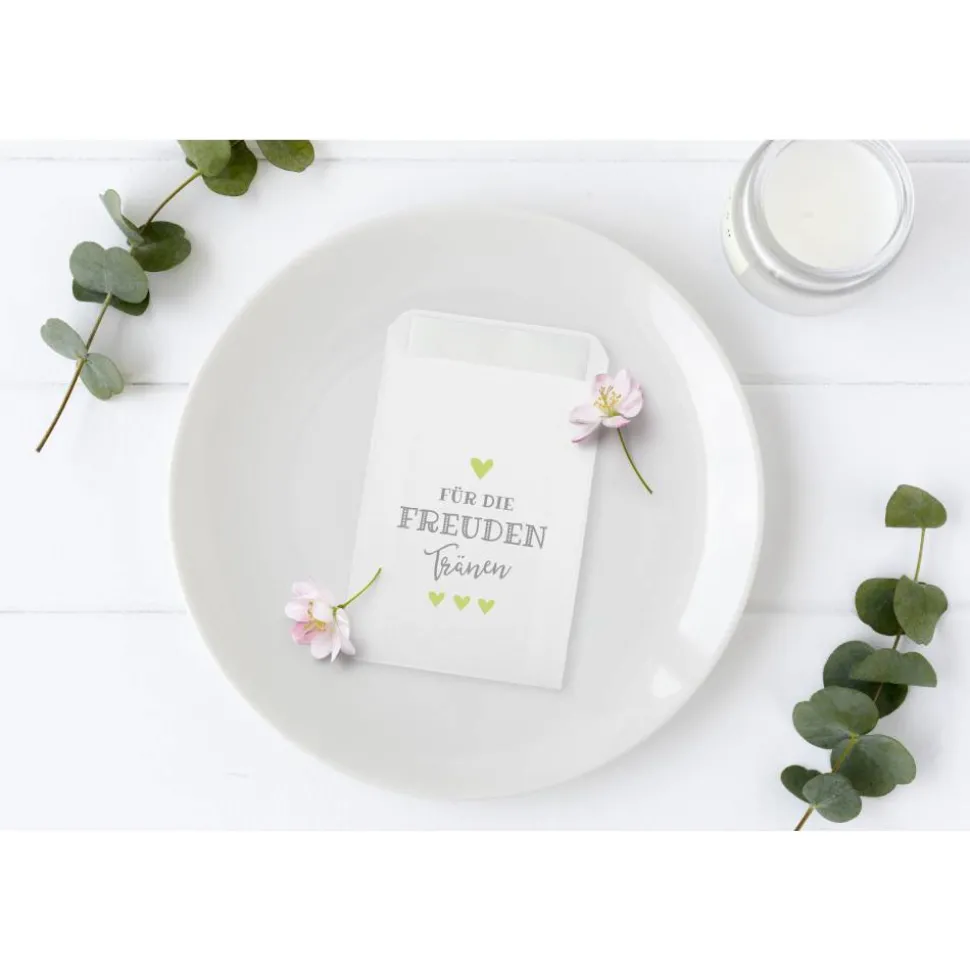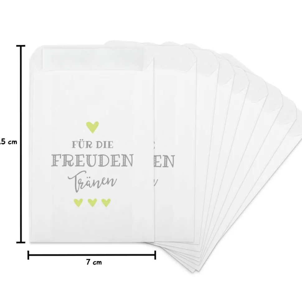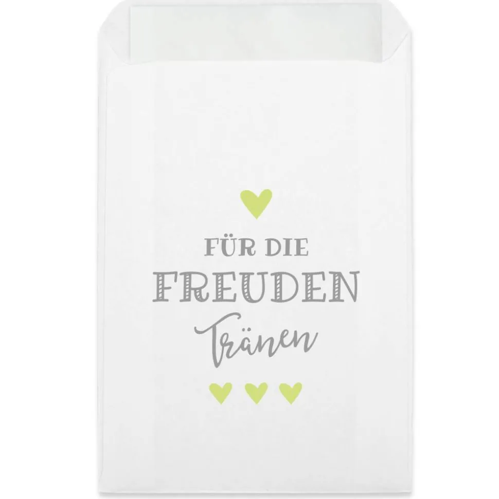 Ihr plant Eure Hochzeitsfeier und möchtet sie noch unvergesslicher gestalten? Dann haben wir die ideale Lösung für Euch! Wir stellen Euch unsere Freudentränen Hüllen vor, die mit dem Aufdruck „Für die Freudentränen“ in grau-hellgrün versehen sind. Mit diesen Verpackungen verleiht Ihr Eurer Hochzeitsdeko eine ganz besondere Note. Bei der Planung Eurer Hochzeit sind die Details entscheidend, um Eure Feier zu etwas Besonderem zu machen. Unsere weißen Premium Flachbeutel sind eine wunderbare Ergänzung für Eure Hochzeitsdeko und ein praktisches Accessoire für Eure Gäste. WICHTIG: Lieferung erfolgt OHNE Taschentücher!