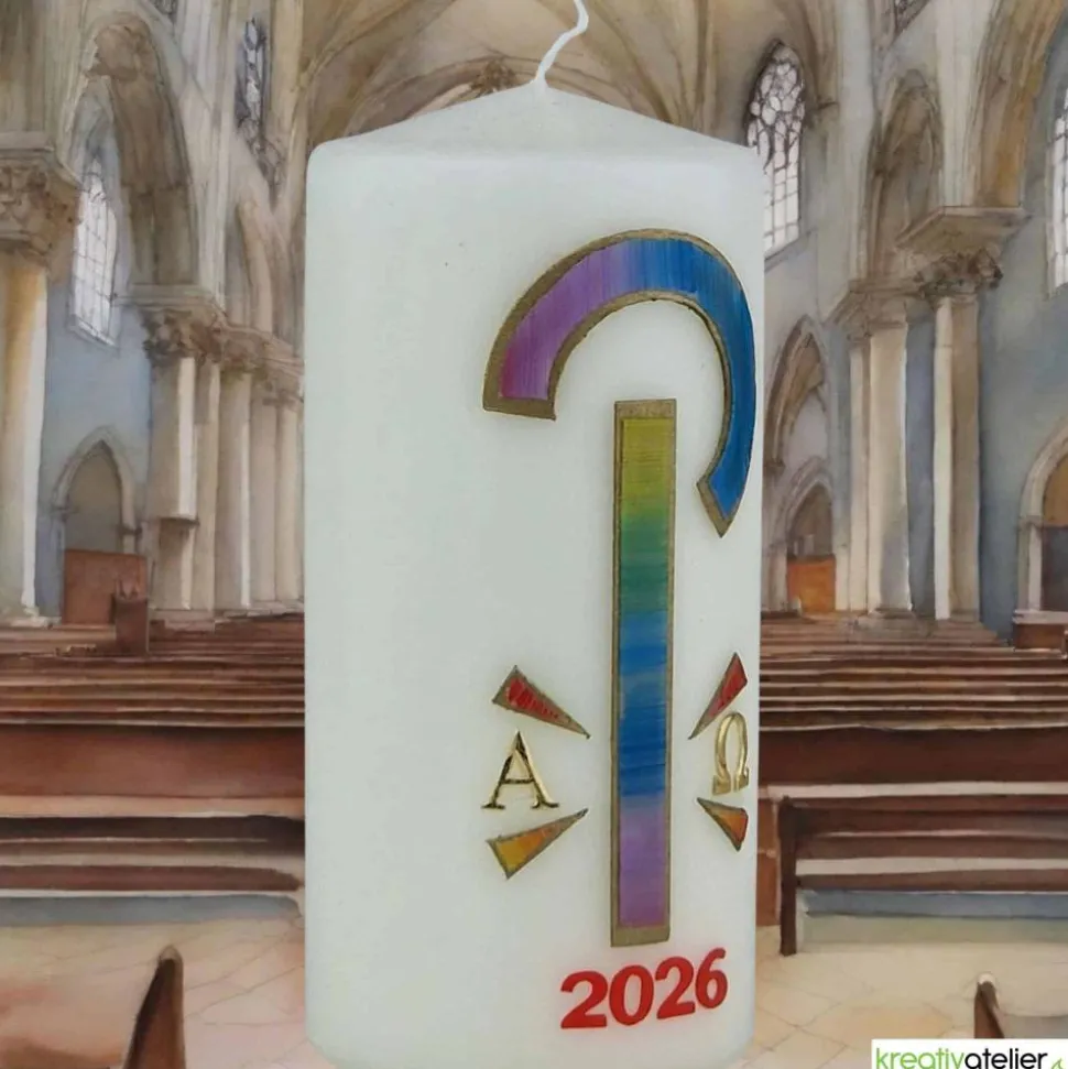 Diese liebevoll von Hand verzierte Osterkerze ist ein wahres Kunstwerk und ein Symbol für das bevorstehende Osterfest. Die Kerze ist mit einem Pax aus Regenbogen-Wachs verziert und trägt das für Osterkerzen typische Alpha/Omega aus goldenen Wachsbuchstaben. Die aktuelle Jahreszahl in rot ist fester Bestandteil der Osterkerze und macht sie zu einem besonderen Andenken an dieses Jahr.