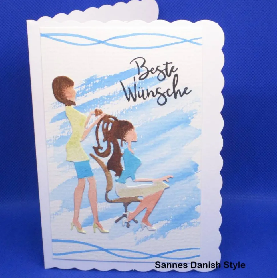 Die Karte ist liebevoll mit Alkoholmarkern koloriert und mit farblich abgestimmten Motivpapieren gestaltet – ein echter Hingucker mit Friseursalon-Flair durch Boden, Wand und Ablage. Friseurin und Kundin sind ausgestanzt und individuell eingefärbt. Jede Karte ist somit ein Unikat und eignet sich auch hervorragend als Geschenk für Friseurinnen.